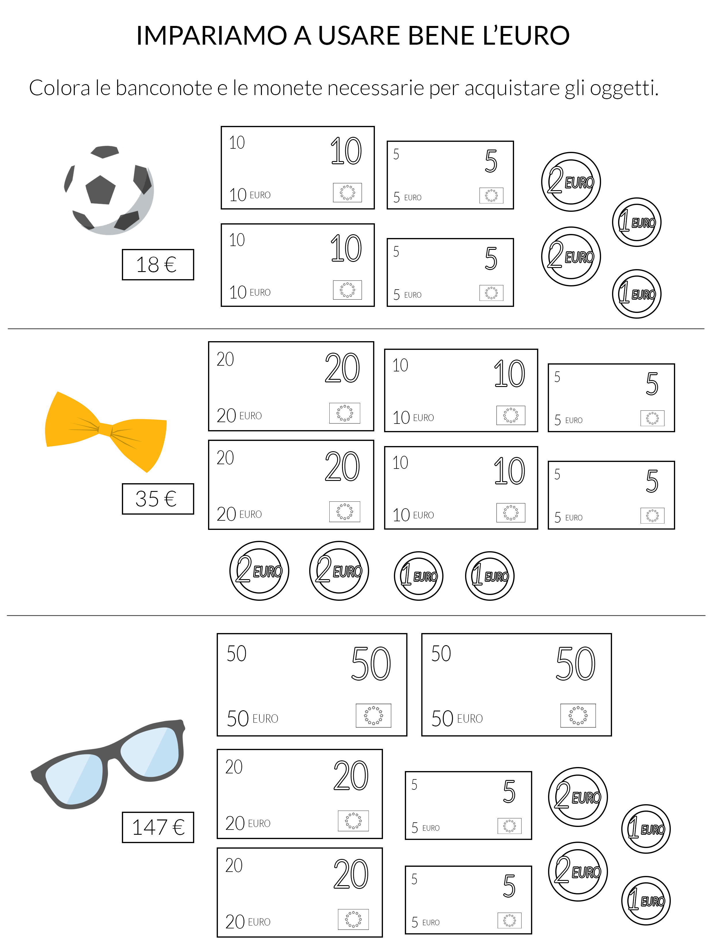 Ora che i ragazzi hanno ben chiaro com’è strutturato l’euro, è il momento di mettersi alla prova: sarebbero capaci di pagare da soli qualcosa al supermercato? Verifichiamolo con questa attività sulla scheda.