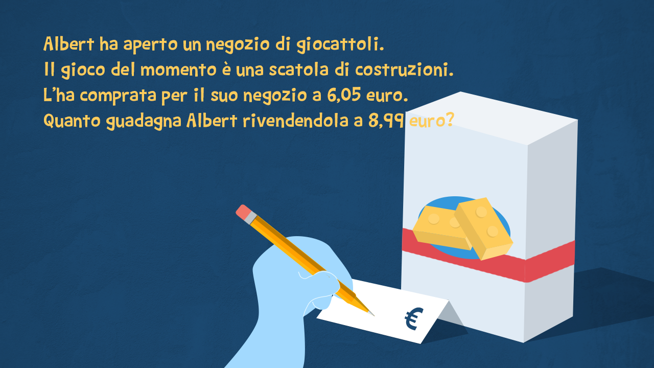 Albert guadagna 8,99 – 6,05 = 2,94 euro per ciascuna scatola di costruzioni che riesce a vendere.