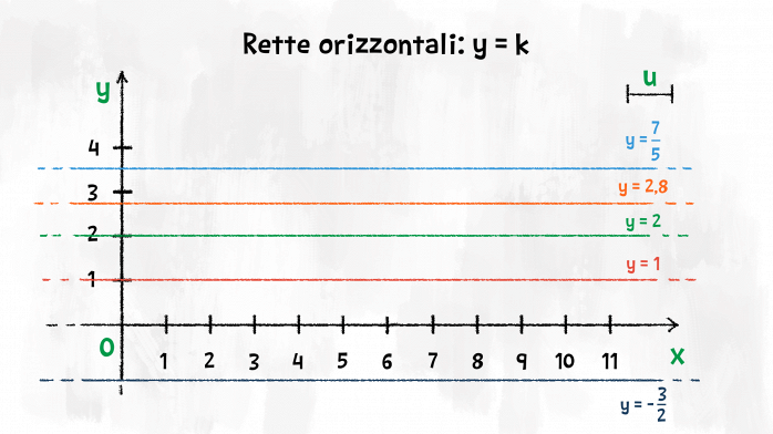 Le rette orizzontali rappresentano tutti i punti con la stessa ordinata, quindi hanno equazione £$ y = k $£ con £$ k $£ numero qualsiasi (intero o razionale). Le rette orizzontali sono tutte parallele all’asse £$ x $£ che rappresenta tutti i punti con ordinata uguale a £$ 0 $£: è la retta che passa per l’origine e ha equazione £$ y = 0 $£.