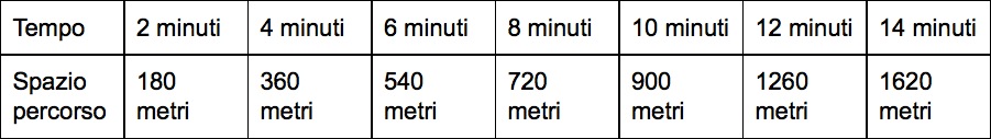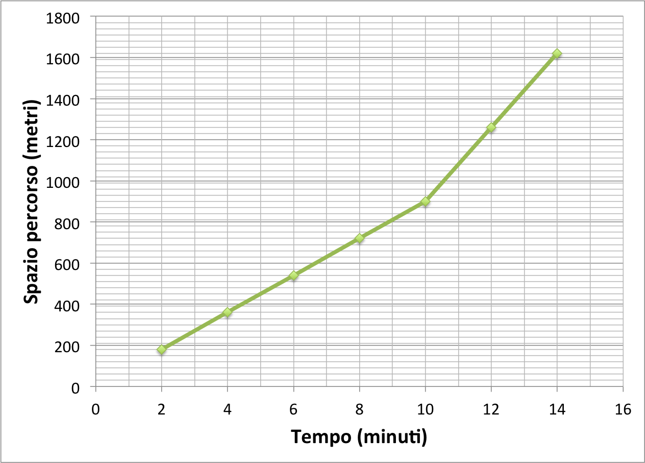 Paolo si sta allenando per la prossima gara di atletica. Come riscaldamento, comincia con 10 minuti di camminata veloce e 4 minuti di corsa. Il suo allenatore ha raccolto dei dati, misurando lo spazio percorso ogni 2 minuti.