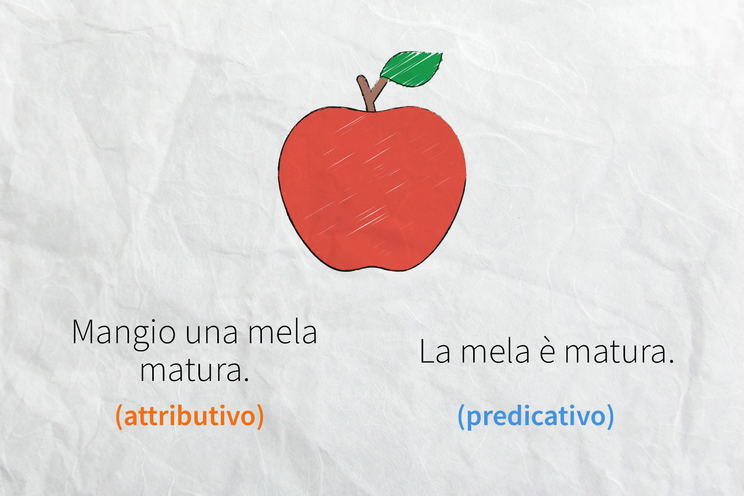 Esempio: Per merenda mangio una mela matura: in questa frase, per esempio, l’aggettivo qualificativo matura è collegato direttamente al nome e dunque è attributivo (perché attribuisce una qualità al nome).