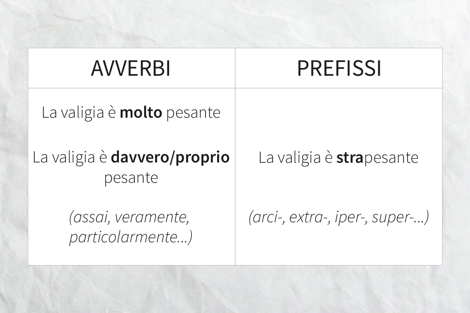 Ci sono anche altri modi per rafforzare l’aggettivo ed esprimere lo stesso concetto: scoprili nella tabella.