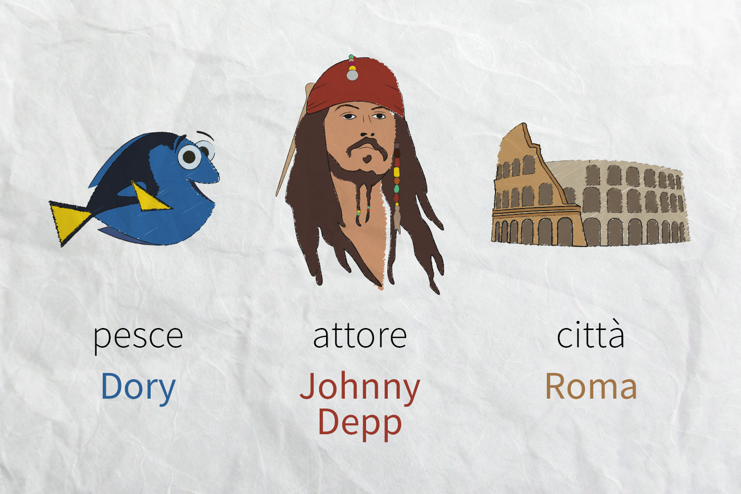 Non è questa però l’unica distinzione tra i vari tipi di nomi: anche Giulia e Lorenzo, infatti, sono nomi di persona, ma non hanno le stesse caratteristiche di attore e scrittrice. Qual è la differenza? Giulia e Lorenzo sono nomi propri, riferiti cioè a individui particolari. Lo stesso vale per Nemo e Dory, nomi propri di animale, e per Roma e Rinascimento, nomi propri di cosa. Tutti questi nomi, come vedi, vanno scritti con l’iniziale maiuscola.