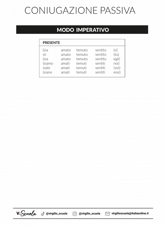 L’imperativo può essere anche passivo: per formalo basta prendere l’imperativo del verbo essere seguito dal participio passato del verbo da coniugare ed ecco che l’imperativo passivo è pronto per essere usato. Scopri come coniugarlo nella scheda: