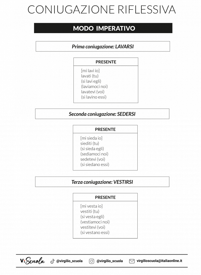 E come si comportano i verbi riflessivi all’imperativo? Mettiti in fila! Si faccia gli affari suoi! Guardiamoci negli occhi! Si diano da fare! Per studiare la coniugazione riflessiva dell’imperativo scarica la scheda:
