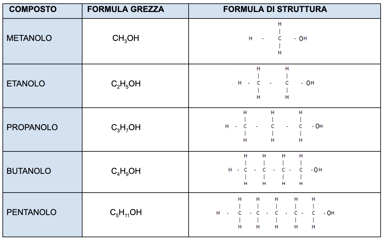 La tabella degli alcoli e altri composti organici