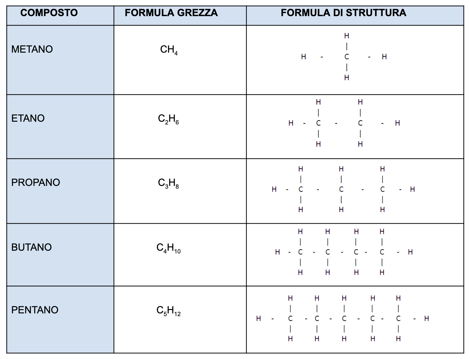 La tabella degli idrocarburi
