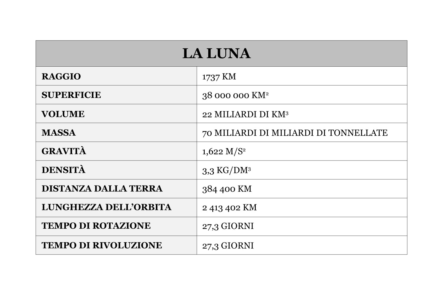 La Luna è il satellite più grande del Sistema Solare, molto vicino alla Terra, caratterizzata da zone pianeggianti scure dette mari e da zone più chiare chiamate altopiani.