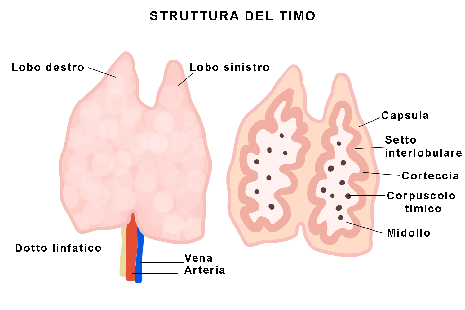 Il timo è situato sotto la tiroide dietro la parte superiore dello sterno. Produce cellule con funzione modulatrice per difendere l’organismo (funzione immunitaria), ovvero i linfociti T.