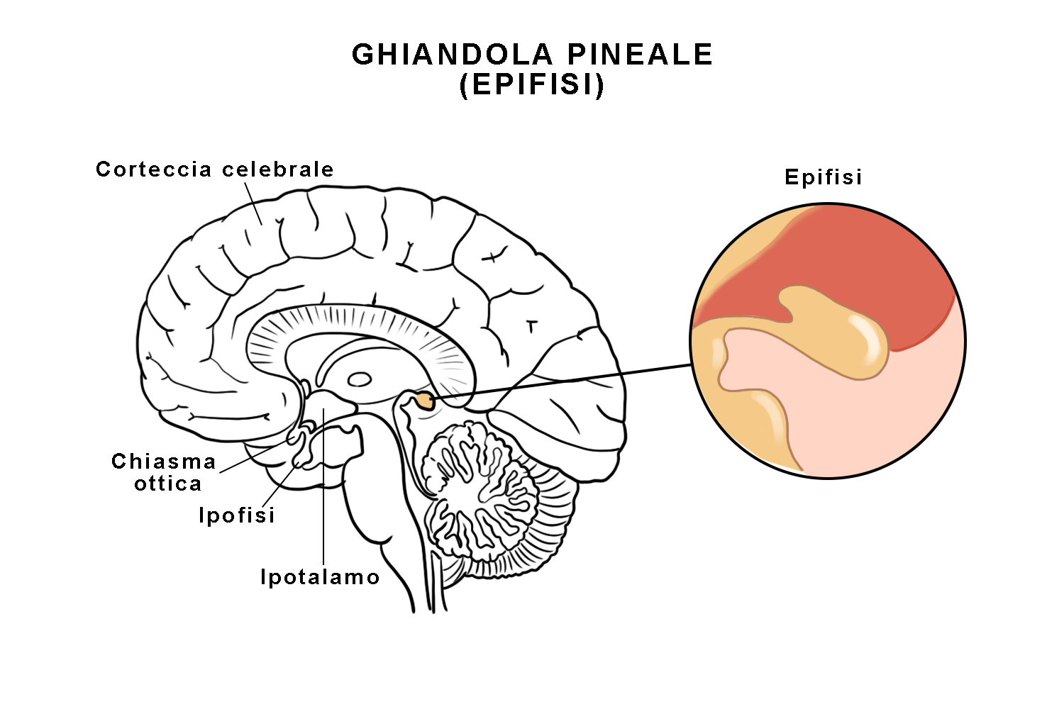 L’epifisi (o ghiandola pineale) è posta all’interno del cranio ed è unita all’encefalo da un peduncolo. Questa ghiandola produce: