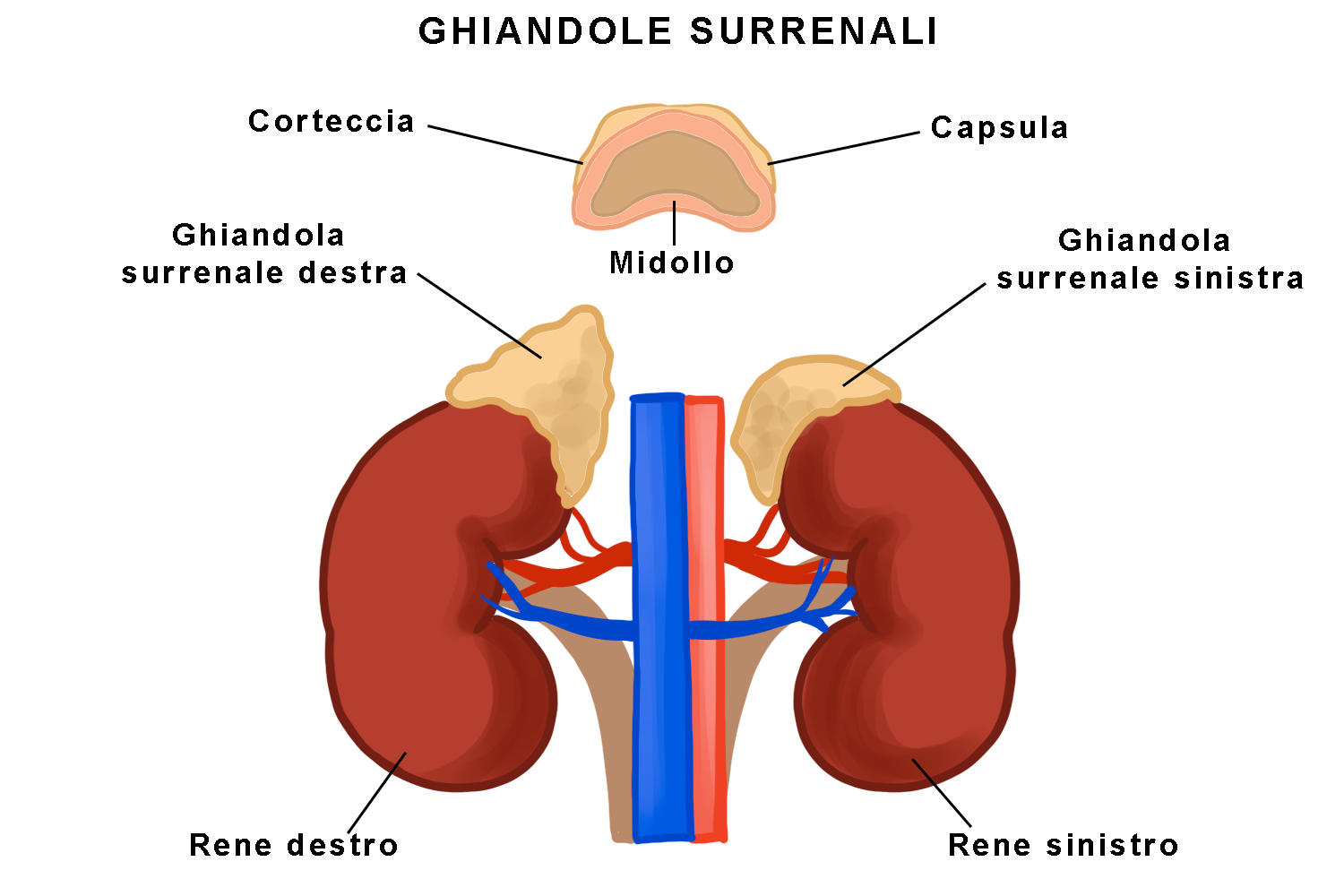 Le ghiandole surrenali (o surreni) sono situate sopra ciascuno dei due reni come un cappuccio. La zona esterna è chiamata corteccia e produce ormoni che regolano l’equilibrio idrico e quello salino del sangue.
