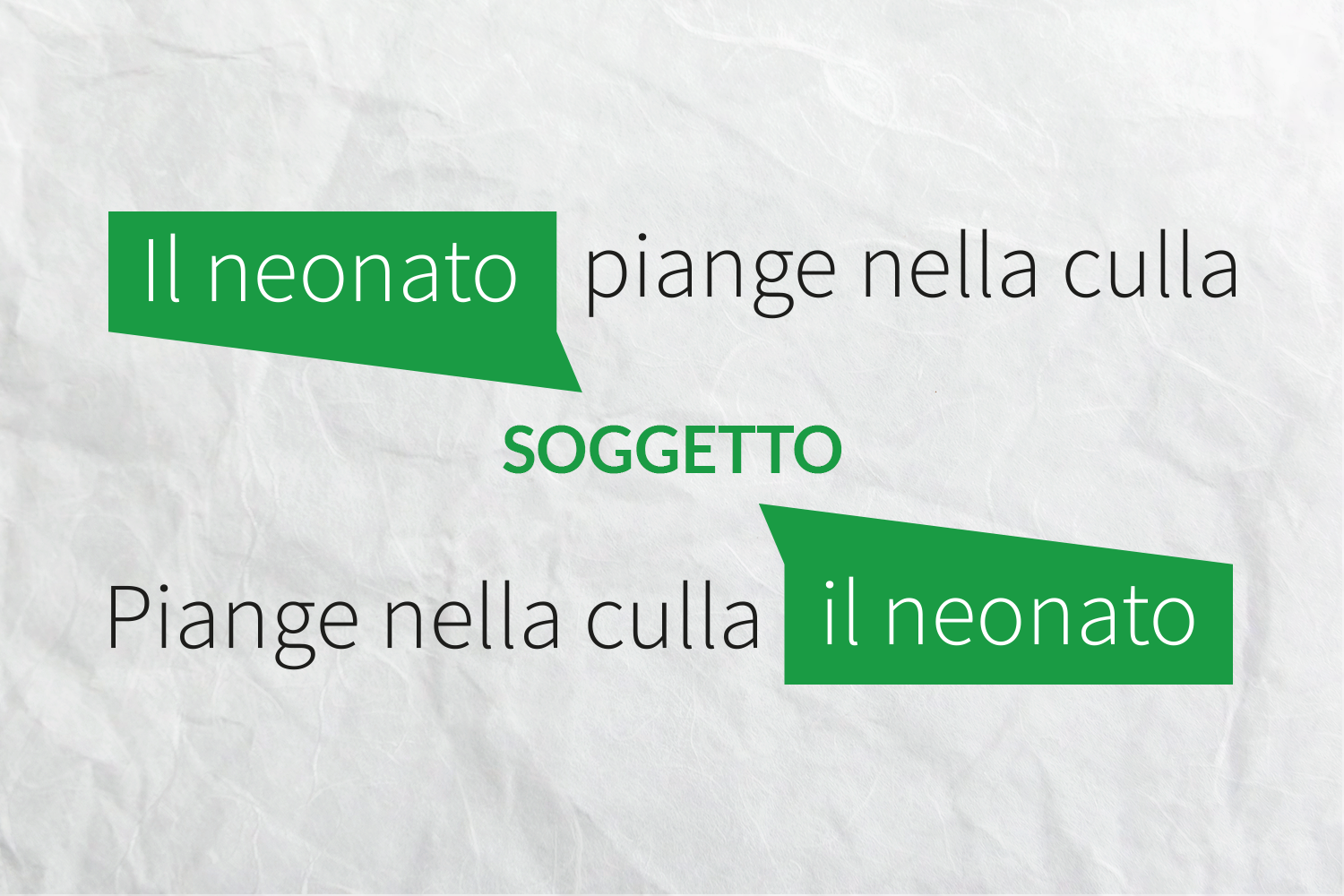 Ad esempio, nella frase “Il neonato piange nella culla” lo si incontra all’inizio e subito prima del predicato. Se invece diciamo “Piange nella culla il neonato” si trova in fondo alla frase, ma concorda sempre con il predicato piange. Se infatti proviamo a trasformare il soggetto al plurale (i neonati) saremo obbligati a cambiare anche il predicato coniugandolo alla terza persona plurale (piangono).