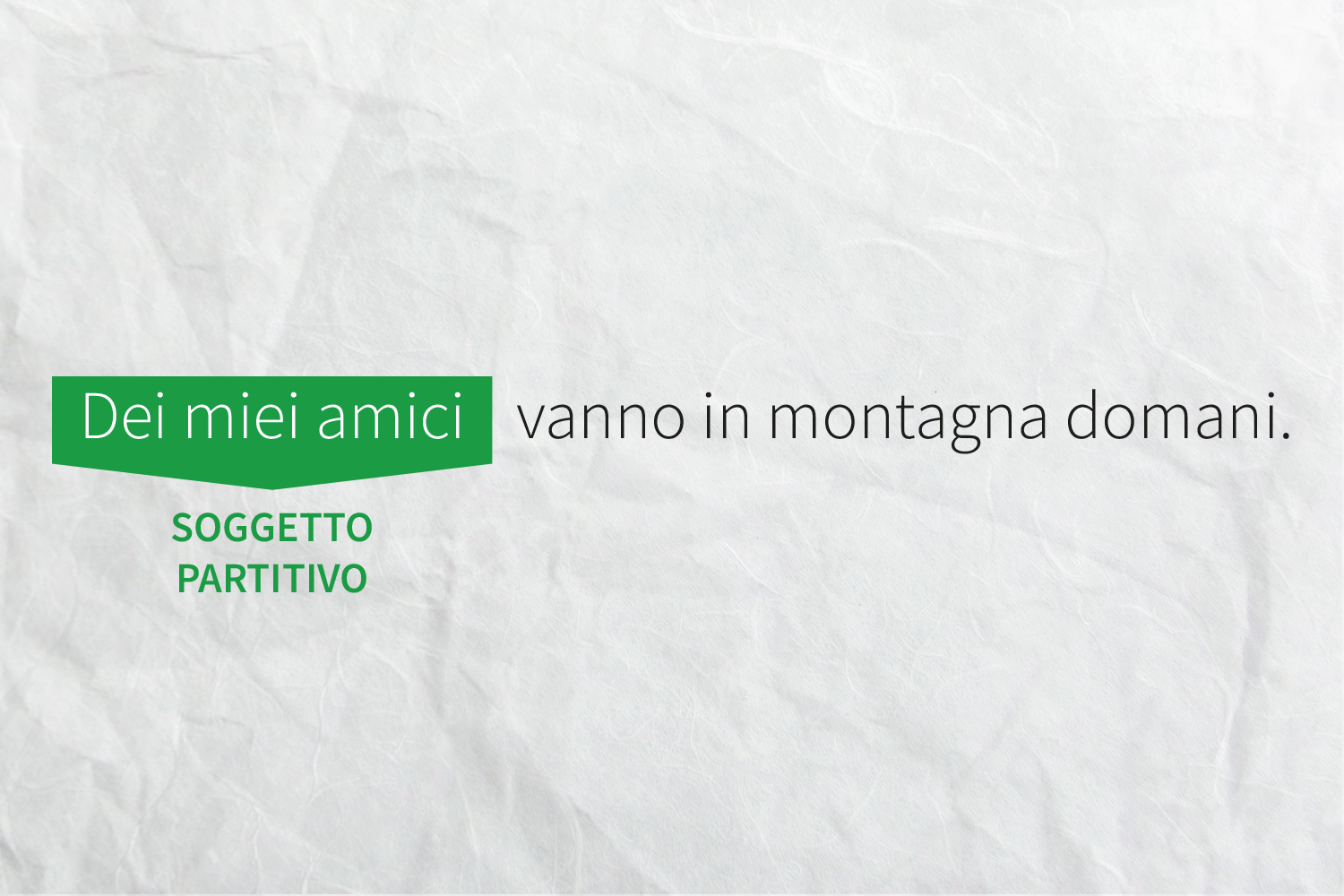 - “Dei miei amici vanno in montagna domani”: non farti confondere dalla presenza di dei. Non si tratta della preposizione articolata, ma dell’articolo partitivo che sta per “alcuni”, quindi “dei miei amici” è il soggetto partitivo, e indica che si tratta di una parte non specifica di amici in generale che andranno in montagna domani;