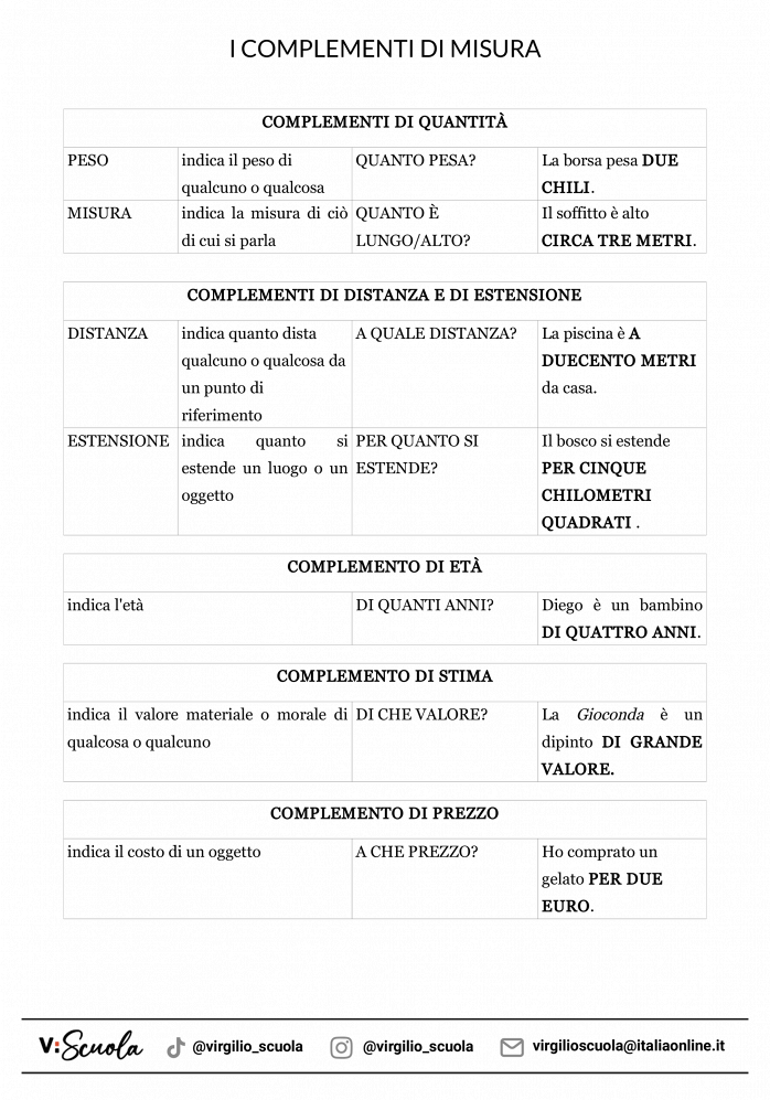 Esistono diversi complementi che indicano la misura o la quantità di qualcosa. Possono riguardare diversi aspetti come il peso, una lunghezza, l’età, un valore astratto o concreto. Scoprili tutti nella scheda.