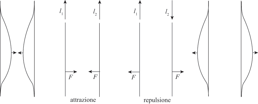 Due fili conduttori rettilinei di lunghezza £$l$£, percorsi rispettivamente da corrente £$i_1$£ e £$i_2$£ e posti a distanza £$d$£ l’uno dall’altro, interagiscono con una forza attrattiva o repulsiva a seconda del verso delle due correnti (correnti nello stesso verso: forza attrattiva, correnti in versi opposti: forza repulsiva), la cui intensità è: $$F= \frac{\mu_0}{2\pi} \frac{i_1 i_2 l}{d}$$