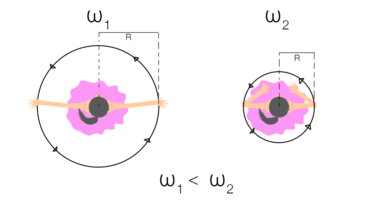 Se una ballerina fa una piroetta e allarga tutto ad un tratto le braccia o le gambe, la sua velocità angolare diminuisce poiché aumentando il raggio (braccia) aumenta anche il momento d’inerzia.