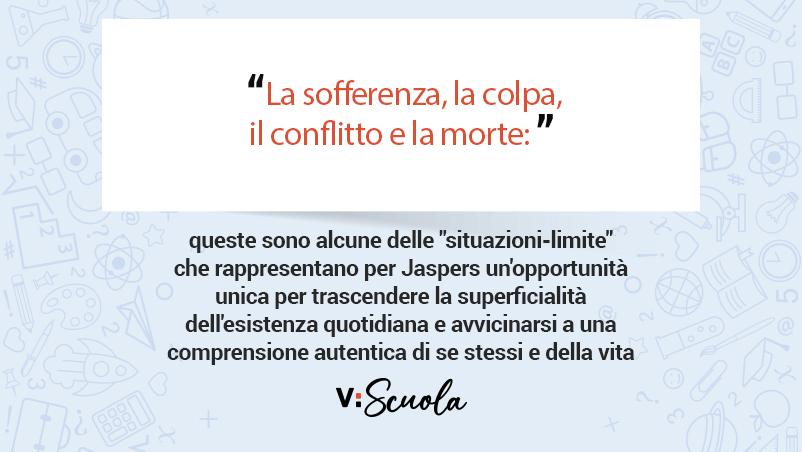 Uno dei concetti più celebri di Jaspers è quello di “situazioni-limite” (Grenzsituationen). Si tratta di esperienze fondamentali che ogni essere umano affronta nel corso della vita e che mettono in discussione le certezze abituali. Tra queste troviamo la sofferenza, la colpa, il conflitto, la morte.