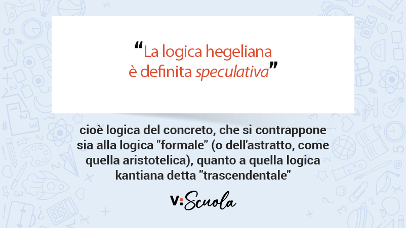 La logica hegeliana è definita “speculativa”, cioè logica del concreto, che si contrappone sia alla logica “formale” (o dell’astratto, come quella aristotelica), quanto a quella logica kantiana detta “trascendentale”. Per Hegel, infatti, il pensare è un qualcosa di oggettivo, che non si esaurisce nell’attività del soggetto. Il pensare costituisce l’anima immanente delle cose: la realtà è pensiero e, quindi, il reale è razionale, nel senso in cui si afferma che esistono leggi nella natura, che c’è della ragione nel mondo e che le cose obbediscono a principi e regole. La logica speculativa, ad ogni modo, non deve soltanto superare i limiti delle logiche formali e trascendentali, ma anche quelli della metafisica che, pur essendo ambivalente (di critica e ammirazione a un tempo), è tutto sommato chiara, al netto dei riconosciuti limiti e difetti: per Hegel, infatti, una delle principali colpe di Kant è stata quella di aver privato il popolo tedesco della metafisica, da non intendere con quella dogmatica pre-critica, bensì, appunto, come “scienza logica”. Non a caso, la scienza della logica studia la forma pura di quelle strutture costituenti l’ossatura della realtà, che nella loro esistenza materiale sono rivestite di caratteristiche sensibili accidentali, empiriche e contingenti: il concetto ha una sua realtà ontologica che si esprime nell’essere vivente, poiché il procedere concettuale è lo stesso della vita reale. Il movimento dialettico, poi, regola la logica e il procedere di una categoria in un’altra: lo sviluppo dialettico, dunque, coincide con l’Aufhebung (il toglimento) e consiste nel pensare una determinazione logica al di là della sua indipendenza, assolutezza e immediatezza, da considerare sempre come “momento” di un intero, “un che di riflesso”. La mediazione di un contenuto logico non è il risultato di un’operazione del filosofo o di un soggetto umano in generale, ma è la struttura interna e immanente a ogni cosa, di cui la logica è l’esposizione. Quindi, non è Hegel a mediare nell’unità superiore del divenire, le determinazioni di essere e nulla, ma sono le stesse determinazioni di pensiero (le Denkbestimmungen) a contenere in sé quel riferimento ad altro e, infine, all’unità concreta di cui sono momenti. Il procedere logico appare, pertanto, composto da elementi contrapposti che si risolvono in una mediazione superiore, esattamente come i concetti contrapposti di essere e nulla che trovano una sintesi nel divenire, o come nella coppia quantità-qualità che supera l’opposizione nel momento in cui si verificano i “salti qualitativi” (il sopravvenire di un incremento puramente quantitativo può produrre una nuova qualità e ne sono un esempio le trasformazioni fisiche da uno stato liquido a uno gassoso o i mutamenti dei regimi politici). La logica “oggettiva”, invece, un tutt’uno che racchiude al suo interno la “Dottrina dell’essere” e la “Dottrina dell’essenza”, è riferita alla realtà che esiste indipendentemente dal soggetto che la pensa, mentre la “Dottrina del concetto” è definita come logica “soggettiva”. A differenza di Kant, per Hegel la logica non è soggetta all’intervento dell’intelletto, ma esiste come oggetto-essere e, nel suo aspetto più intimo, come essenza. Il primo presentarsi della realtà avviene nelle forme immediate e intuitive di quantità, qualità e misura, ma successivamente è fondamentale cogliere ciò che è all’origine nascosto nella realtà dell’essere: l’essenza, che rappresenta «la verità dell’essere» e che si contrappone antiteticamente al grado positivo dell’essere. Da questa opposizione dialettica nasce la sintesi del mondo del “fenomeno” (Erscheinung) e della “realtà effettuale” (Wirklichkeit), cioè della realtà del nostro vivere quotidiano. La logica “oggettiva” rappresenta – nella struttura dialettica della speculazione hegeliana – il grado preparatorio che sarà illuminato dall’avvento del “concetto”, cioè della logica “soggettiva”, così definita perché l’attività del pensare (e quindi la formazione del concetto) esprimono la sfera essenziale del nostro agire. Il concepire, del resto, non è altro che il momento in cui l’uomo si svincola dalla rappresentazione della necessità naturalistica dell’essere e dell’essenza e giunge, così, alla libertà del pensiero concettuale.