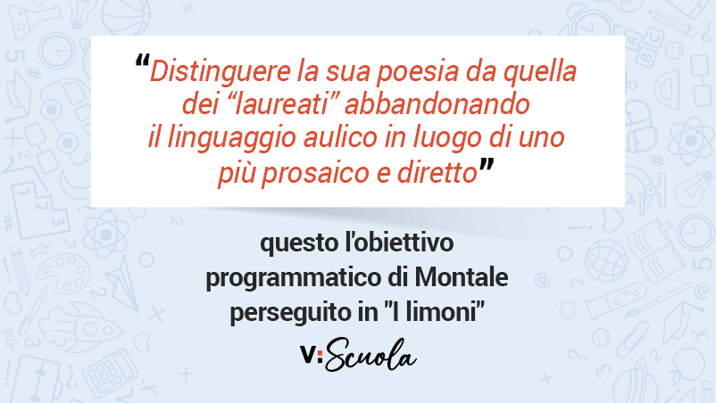 L’intenzione manifesta di Montale è quella di distinguere in maniera netta la sua poesia da quella dei “laureati” e di farlo attraverso l’unico strumento in suo possesso, il linguaggio, che non sarà più quello aulico e scarsamente comprensibile adottato dai vati, ma quello più prosaico e diretto, che trova riscontro nella realtà. Un obiettivo programmatico, che appare evidente sin dalla prima parola che apre “I limoni”, quello “Ascoltami” con il quale si rivolge al lettore con un tono imperativo e confidenziale, che prosegue trascinandolo su un terreno a lui noto e che non si basa sulla parola indeterminata, ma sulla cosiddetta “poetica dell’oggetto”, che in questo caso sono proprio i gialli e aspri, ma anche incredibilmente profumati frutti.