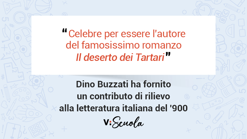 Scrittore, giornalista, pittore, drammaturgo, librettista, scenografo, costumista e poeta, celebre per essere l’autore del famosissimo romanzo “Il deserto dei Tartari”, Dino Buzzati ha fornito un contributo di rilievo alla letteratura italiana del ‘900. Autore di romanzi e racconti, caratterizzati da uno stile surreale e realistico-magico, è considerato uno dei maggiori autori fantastici della sua epoca, al punto da meritarsi la definizione di “Kafka italiano” per via delle atmosfere surreali e fantastiche che permeano i suoi scritti. Un paragone che però Buzzatti rigetterà sempre.