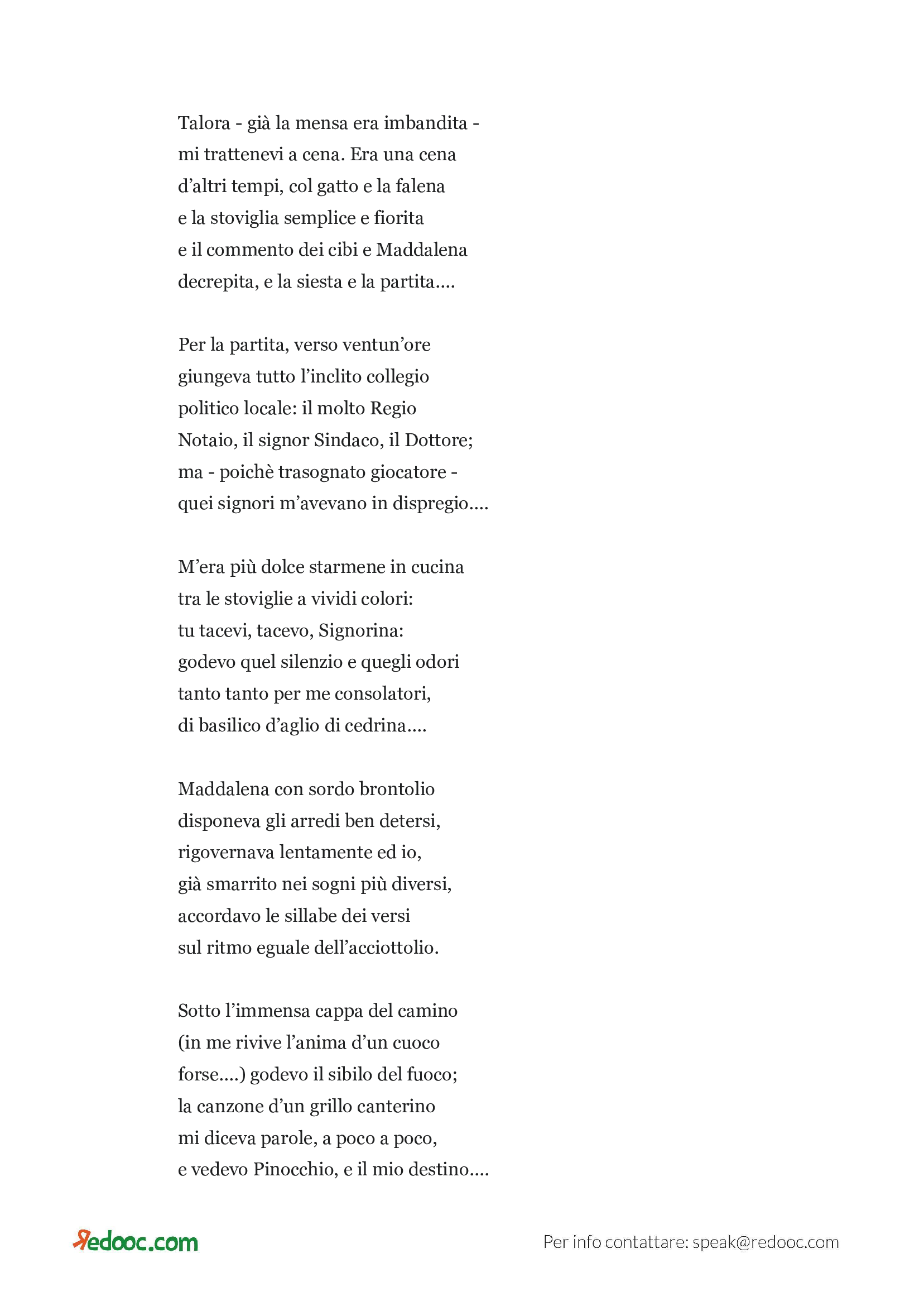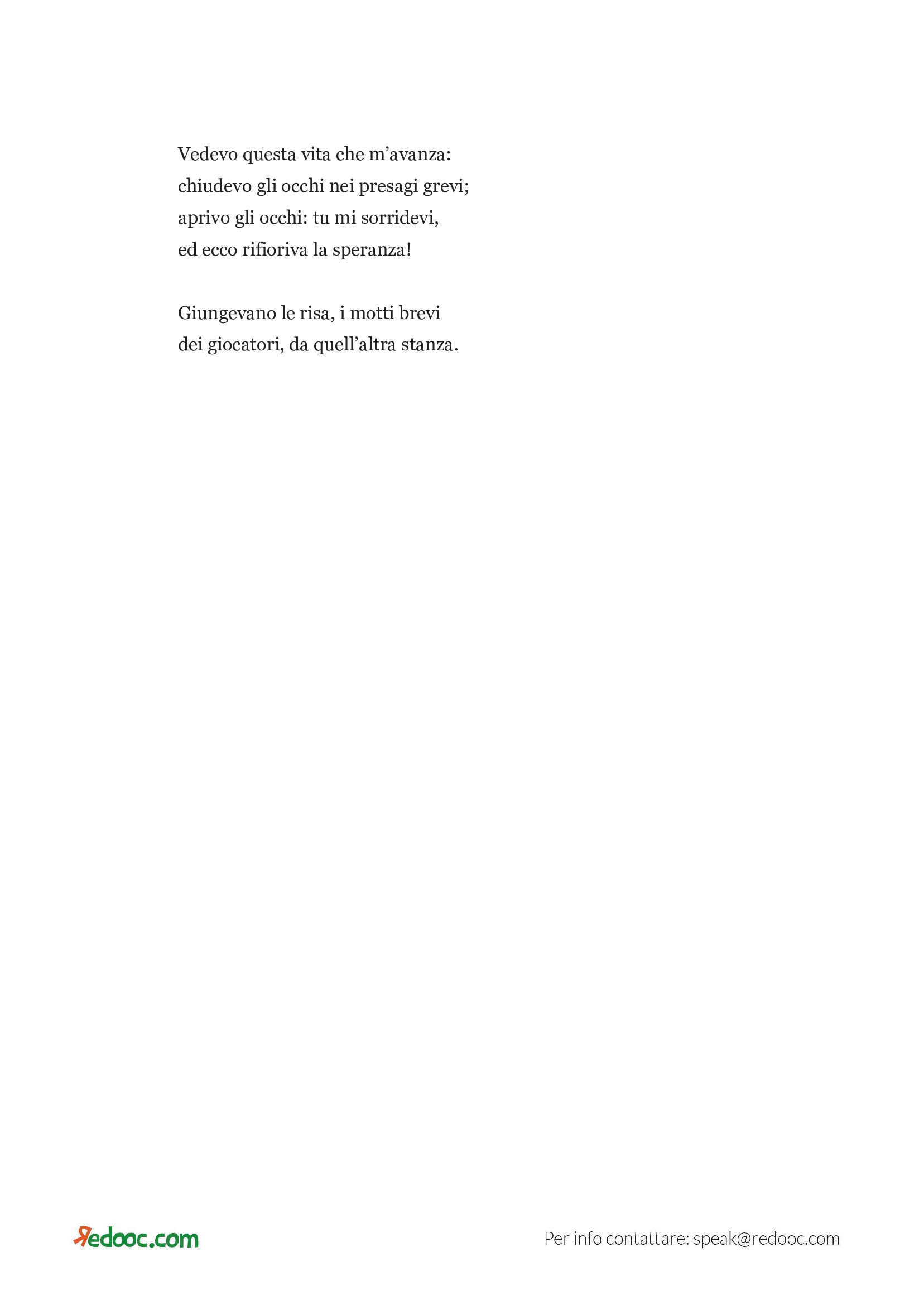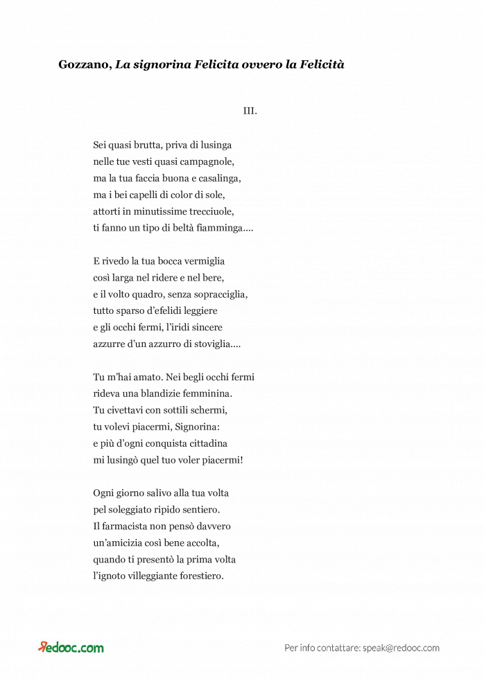 Leggi il brano proposto e goditi il gioco letterario ideato dall’autore. La vita vera risiede nella quotidiana banalità, nella ripetizione di azioni, lontana da ogni falsa perfezione estetica-letteraria. L’imperfezione estetica e la pacatezza caratteriale di Felicita sono per Gozzano un porto sicuro, un appiglio nei momenti di sconfortante solitudine.