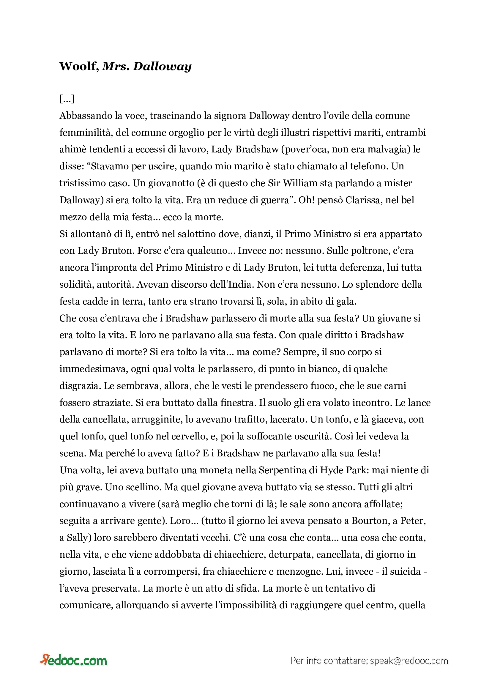 Nel romanzo Mrs. Dalloway (1925) tutto si svolge in un’unica giornata o, più precisamente, nella sola mente della protagonista. Clarissa Dalloway appare al lettore come una donna frivola che conduce una vita agiata, il cui solo problema è la scelta dei fiori da comprare in occasione di una festa. Proseguendo nella lettura tuttavia il livello di introspezione psicologica e complessità del personaggio aumenta. Alla frivolezza iniziale segue una forte pesantezza e intensità: il romanzo ondeggia tra perdita di speranze e accettazione della vita. La sera, tra chiacchiericcio e festeggiamenti, gli ospiti di Mrs. Dalloway sono informati del suicidio di un veterano di guerra, avvenuto nel pomeriggio. Nessuno dei presenti è scosso dalla notizia, ma Clarissa si immobilizza.