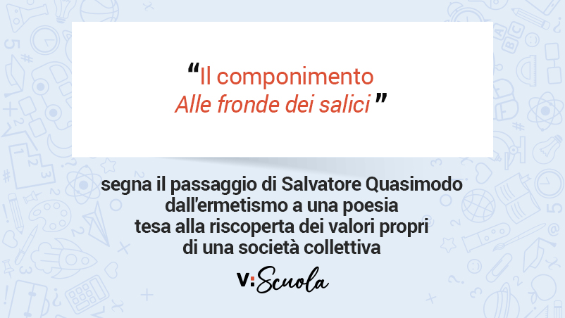 Con il componimento “Alle fronde dei salici", Salvatore Quasimodo decreta la sua uscita dall’ermetismo e l’individualismo che ne avevano caratterizzato l’opera, per abbracciare una poesia tesa alla riscoperta dei valori propri di una società collettiva.