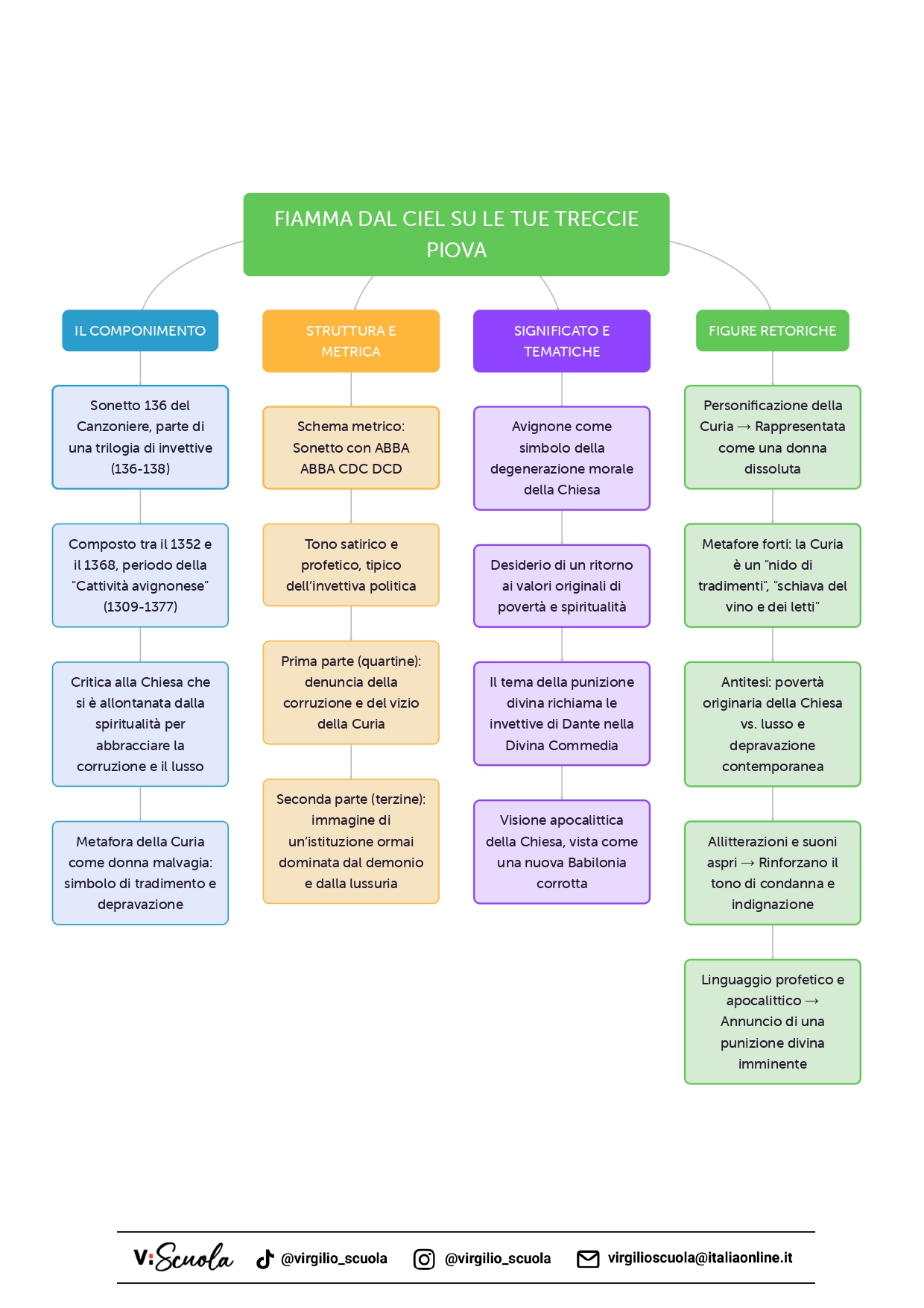 Nel sonetto Fiamma dal ciel su le tue treccie piova, Francesco Petrarca abbandona il tono malinconico e contemplativo tipico della sua lirica per lasciar emergere un’invettiva potente e accesa contro la corruzione morale della corte papale di Avignone. Attraverso immagini violente e cariche di pathos, il poeta invoca la giustizia divina affinché punisca un mondo dominato dall’avidità e dall’ipocrisia.
