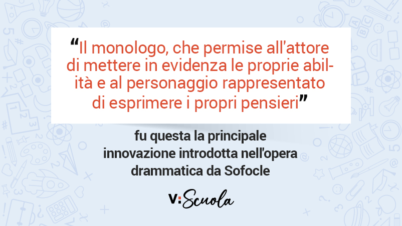 Sofocle abolì l’obbligo della “trilogia legata” e per la prima volta utilizzò il terzo attore, che portò ad una maggiore articolazione dei rapporti interpersonali e ad una nuova scioltezza dinamica del ritmo teatrale. Inoltre, portò da dodici a quindici i coreuti, al fine di accentuare la funzione del corifeo e dell’elemento spettacolare, e perfezionò l’uso delle scenografie. I cori si allontanarono dall’azione, partecipando in maniera sempre meno attiva e diventando, di fatto, spettatori e commentatori dei fatti narrati. A Sofocle si deve, inoltre, l’introduzione del monologo, che permise all’attore di mettere in evidenza le proprie abilità e al personaggio rappresentato di esprimere – e condividere con il pubblico – i propri pensieri.