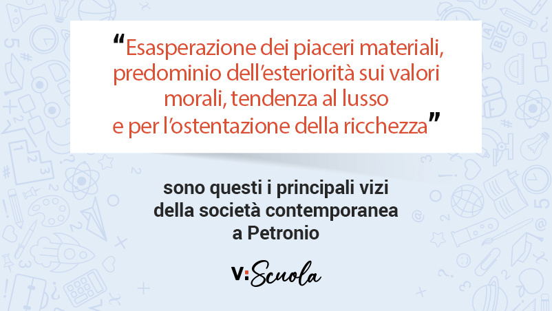 Il Satyricon si inserisce in un clima intellettuale particolarmente attento alla riflessione sulla degenerazione del potere imperiale e sulla decadenza morale della società romana e, al tempo stesso, del tutto estraneo a qualsiasi intento moralistico. Petronio, infatti, utilizzando la finzione letteraria e l’ironia a più livelli come una sorta di ‘filtro’, fotografa con grande realismo il mondo in cui vive e ne fa il vero protagonista della sua opera, da cui emergono tutti i difetti e i vizi della società contemporanea: dall’esasperazione dei piaceri materiali, in primis il cibo e il sesso, al predominio dell’esteriorità sui valori morali, passando per la tendenza al lusso e per l’ostentazione della ricchezza, tipica soprattutto dei cosiddetti ‘nuovi ricchi’, e cioè i liberti. Il romanzo, ad ogni modo, si ricollega alla satira sociale sia per la sua forma esametrica, sia come variante della satira menippea, con cui condivide il prosimetro. I fatti licenziosi e il realismo, invece, sono un evidente segno degli influssi della novella milesia. Satira, erotismo e parodia rendono quest’opera – che alterna prosa e versi – una creatura ‘ibrida’, che prende senza dubbio spunto dal romanzo greco di età ellenistica, ma ne ribalta completamente i canoni. Anche se Petronio non è il primo autore a offrire un giudizio personale sui costumi e le abitudini del popolo, criticandone l’avidità, la corruzione e la dissolutezza, ciò che distingue il Satyricon dalle satire di Lucilio o Persio è che l’immagine della società non è deformata dal moralismo conservatore tipico della mentalità romana: qui, infatti, appare assai complicato comprendere il suo pensiero e la sua posizione sui temi trattati. La tecnica narrativa adottata, inoltre, comporta un mutamento di prospettiva rispetto alla satira: il punto di vista è interno al racconto, soggettivo, e non coincide con quello dell’autore e spesso nemmeno con quello del narratore. Tale soggettivismo è evidenziato anche dalla cosiddetta “mimesi dello stile”: ciascun personaggio, infatti, si esprime a seconda della sua posizione sociale e del suo livello di istruzione. Si può dunque concludere affermando che il Satyricon sia un’imitazione del reale, che riduce al minimo la stilizzazione e gli schemi fissi al tal punto da essere considerato, se non proprio un unicum, quantomeno un caso rarissimo nella letteratura antica.