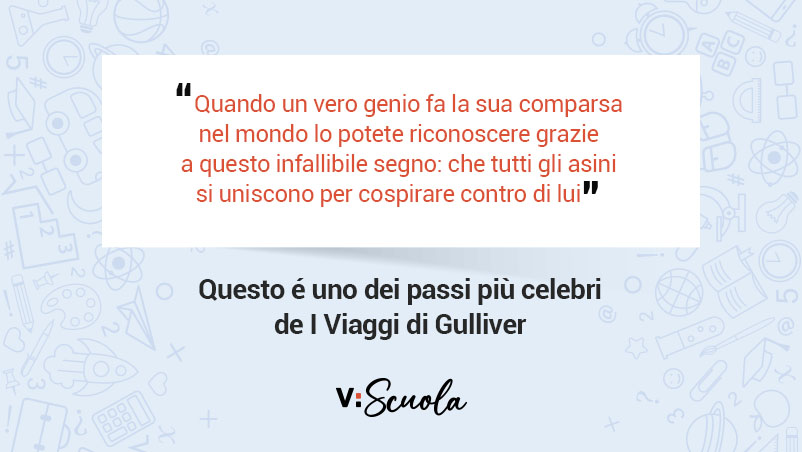 I viaggi di Gulliver è un romanzo scritto nel 1726 dallo scrittore irlandese Jonathan Swift (1667-1745). Ne I viaggi di Gulliver vengono mescolate sapientemente dall’autore fantasia e satira, per un risultato sì fabiesco e avventuriero ma anche di grande critica sociale. I viaggi che vedono protagonista Gulliver descrivono le disavventure di Lemuel Gulliver, medico di bordo che, durante i suoi viaggi marittimi, incontra popolazioni fantastiche su isole immaginarie che, a prima vista, sembrano paradisi terrestri. Con un tono volutamente fiabesco, Swift riesce a descrivere le miserie dell’animo umano.