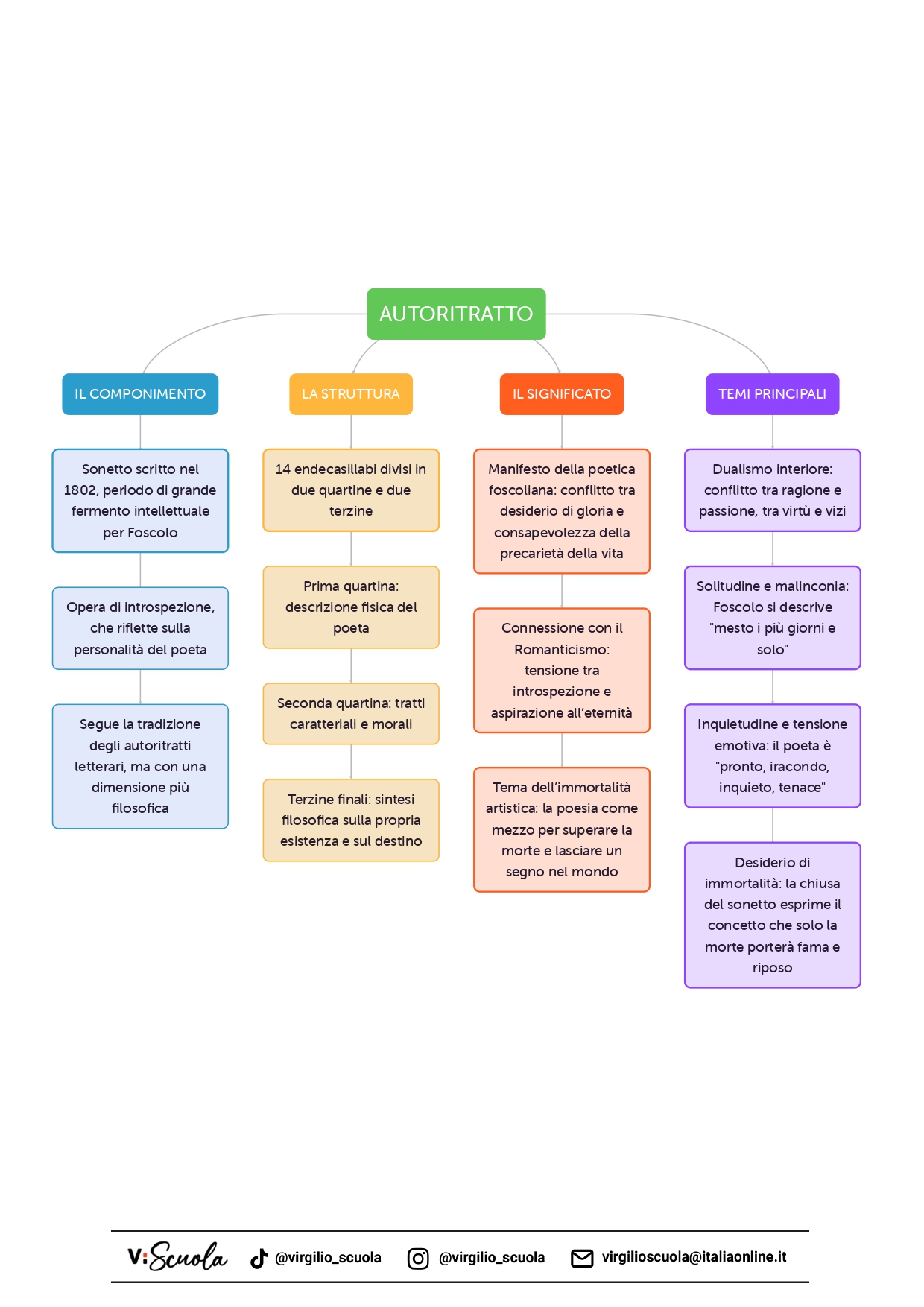In “Autoritratto", Foscolo si confronta direttamente con la propria identità. Il sonetto si inserisce nella tradizione degli autoritratti letterari, seguendo l’esempio di autori come Vittorio Alfieri. Tuttavia, Foscolo va oltre, utilizzando la descrizione fisica e morale per esplorare la condizione umana e le tensioni interiori che contraddistinguono il suo animo. Il sonetto è un dialogo con sé stesso e con il lettore, in cui emerge una personalità complessa, segnata da un profondo dualismo tra ragione e passione, tra virtù e vizi, tra il desiderio di conformità e l’insofferenza verso le regole sociali.