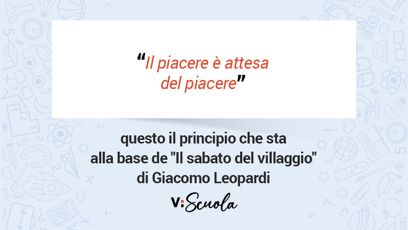 “Il piacere è attesa del piacere”, la teoria di Giacomo Leopardi è rappresentata in uno dei componimenti più importanti sotto il profilo concettuale della poetica e della concezione del mondo dell’autore, Il sabato del villaggio. Composta nel 1829, a breve distanza dall’altrettanto centrale “La quiete dopo la tempesta”, la poesia è inserita nei Canti, precisamente nella sezione “Grandi idilli”.