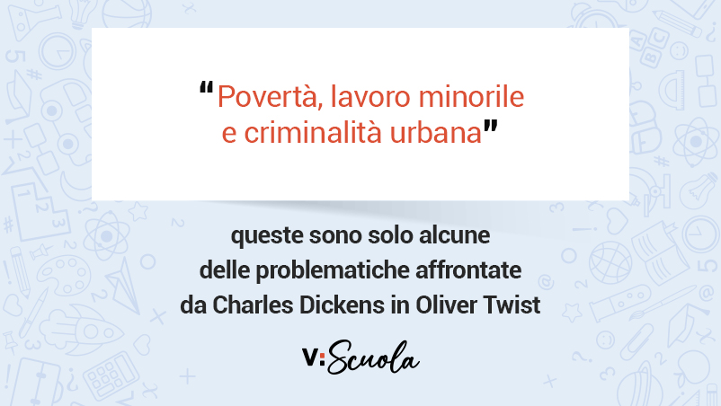 “Oliver Twist” è uno dei lavori più importanti di Charles Dickens, celebre autore britannico del XIX secolo. Scritto dopo la promulgazione della “Poor Law” del 1834, che bloccava l’assistenzialismo ai poveri, a meno che non entrassero nelle workhouses, esce inizialmente a puntate mensili sulla rivista “Bentley’s Miscellany”, tra il 1837 e il 1839, e riscuote un successo talmente immediato da ispirare messe in scena teatrali ancor prima del termine degli episodi. Pubblicato anche come romanzo nel 1838, “Oliver Twist” assume sin da subito un’importante rilevanza sociale, portando per la prima volta alla luce le mille contraddizioni dell’Inghilterra Vittoriana, mostrandone aspetti come la povertà, il lavoro minorile, la criminalità urbana, con un dissacrante black humor. A differenza delle “Newgate Novels”, che narravano le affascinanti avventure di criminali, elevati ad eroi popolari, Dickens sceglie una sorta di racconto “anti-romantico”, nel quale non santifica i suoi delinquenti, lasciandoli liberi di agire e decidere all’interno di una società che li ha già imprigionati in una legge sociale dalla quale non si può cambiare. Oliver, riveste così il ruolo di emblema dei suoi tempi, simbolo di una realtà oppressiva, governata da un darwinismo sociale, in cui i più poveri e deboli continueranno ad essere vessati dai padroni, cui il protagonista sfuggirà solamente ritirandosi in campagna. L’autore critica così i sistemi educativi della società britannica, ben raffigurati dalla Londra del suo tempo, una grande città dove i poveri, soprattutto gli orfani, crescono senza alcuna istruzione e vengono sfruttati per lavorare fin dalla tenera età o introdotti al crimine. Una situazione contro la quale lo scrittore britannico prende posizione attraverso la “ribellione” di Oliver alle misere razioni di cibo, e per cambiare la quale auspica una riforma sociale che migliori le condizioni di vita delle fasce più svantaggiate della popolazione attraverso l’attività filantropiche della “buona” borghesia, quella dei suoi personaggi Mister Brownlow e Miss Maylie, che si prendono cura del giovane protagonista, cambiandone il destino.