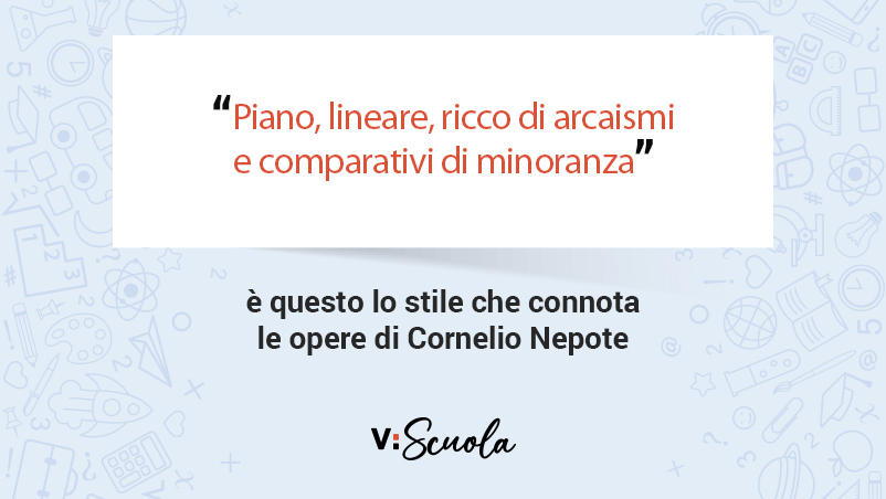 Ispirandosi ai ‘poetae novi’, probabilmente in età giovanile, Cornelio Nepote iniziò a comporre dei versi ma, non ottenendo i risultati sperati, abbandonò presto questa forma d’arte, pur restando fedele alla linea estetica da loro supportata. Secondo le testimonianze di Catullo, Ausonio e Aulo Gellio, egli fu l’autore dei Chronica, un’opera andata interamente perduta ma che, originariamente, sarebbe stata strutturata in tre libri che si presentavano come una sorta di compendio di storia universale, dall’età mitica fino a quella contemporanea. Tale ambizioso lavoro dello storico e biografo di Hostilia, che si ipotizza possa essersi basato sull’omonima opera del greco Apollodoro, fu estremamente apprezzato da Catullo che, sempre nel suo ‘Liber’ (I, 5-7), scrisse: «ausus es unus […] / omne aevum tribus explicare chartis / doctis […] et laboriosis» (“Tu solo osasti spiegare tutta la storia in tre libri pieni di cultura e di duro lavoro"). Aulo Gellio e Carisio, inoltre, testimoniarono l’esistenza di un’altra significativa opera di Cornelio Nepote, gli ‘Exemplorum Libri’, una raccolta di episodi aneddotici suddivisi in cinque tomi. Il ‘De viris illustribus’, poi, fu una raccolta di biografie in sedici libri ripartiti in sezioni. Di questa opera è pervenuto integralmente fino ai giorni nostri solo quello dedicato ai condottieri stranieri, intitolato ‘De excellentibus ducibus exterarum gentium’, oltre, in maniera isolata, alle vite di Catone il Censore e di Attico. Il suo stile si connota per essere piano e lineare, a prima vista particolarmente semplice, al punto da essere stato considerato monotono e denso di notizie e informazioni estremamente schematiche e sommarie, nonostante abbia tentato, soprattutto nella biografia di Attico, di ricalcare la ben più complessa scrittura dell’amico Cicerone: proprio questa sua ‘essenzialità’ ha fatto sì che Cornelio Nepote sia diventato – insieme a Giulio Cesare, Fedro ed Eutropio – uno degli autori maggiormente tradotti da chi si appresta a studiare il latino. Il linguaggio, talvolta colorito, presenta sovente alcuni arcaismi ma, a differenza di molti altri autori latini, adopera frequentemente il comparativo di minoranza: presso i Romani, infatti, era assai più frequente il tentativo di evidenziare l’abbondare di una qualità, anziché la carenza.