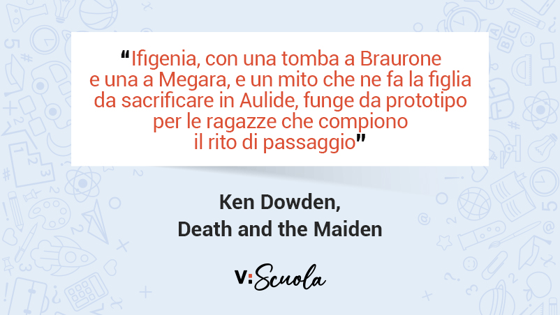 Protagonista delle tragedie ‘Ifigenia in Aulide’ e ‘Ifigenia in Tauride’ di Euripide, fu la primogenita di Agamennone, re dell’Argolide e capo supremo degli Achei nella guerra di Troia, e di Clitemnestra, nonché sorella di Oreste, Elettra e Crisotemi. Tuttavia, Antonino Liberale raccontò che, in realtà, fosse la figlia di Teseo ed Elena. Questa, rapita da giovane dall’eroe, che la violò, venne salvata dai Dioscuri e giurò loro di aver mantenuto la propria verginità. Ad Argo, però, sulla strada del ritorno, partorì una bambina di nome Ifigenia e consacrò ad Artemide un santuario in segno di gratitudine per il parto alleviato dalla sofferenza. Quindi, affidò la neonata a Clitemnestra, che la adottò. Ad ogni modo, si dice che, un giorno, Agamennone promise di sacrificare ad Artemide la creatura più bella sbocciata nel suo regno in quell’anno, lo stesso in cui poi venne alla luce Ifigenia. Rifiutandosi, però, di immolarla, probabilmente sostituendola con una capra sacra, la dea, risentita, scatenò dei venti fortissimi che impedirono alle navi greche, nei pressi delle coste di Aulide, di salpare verso Troia. L’indovino Calcante – o, secondo altri, l’oracolo di Delfi – a vaticinare che, senza il sacrificio della più bella fra le sue figlie, la flotta del sovrano non sarebbe mai stata in grado di portare a compimento la propria missione. Agamennone si oppose, sostenendo che Clitemnestra non lo avrebbe mai permesso, ma le truppe achee insorsero, minacciando di giurare fedeltà a Palamede. Proprio quest’ultimo venne eletto dall’esercito quando fu deciso che, fin quando non avesse rispettato la volontà di Artemide, il re sarebbe stato sospeso dalle sue prerogative. Anche Menelao esortò il fratello affinché permettesse a Ulisse e Taltibio di andare a Micene e condurre Ifigenia in Aulide, con il pretesto che, se Achille non l’avesse presa in moglie, si sarebbe rifiutato di salpare per Troia. Clitennestra accompagnò la figlia dal padre, onorata dall’idea di divenire suocera di Achille, restando tuttavia in preda allo sconforto quando scoprì il vero motivo del viaggio: non le nozze, bensì il suo sacrificio. Fu questo inganno la causa che scatenò nella donna un feroce odio nei confronti di Agamennone, che la porterà prima a tradirlo e poi, una volta ritornato dalla guerra, ad ucciderlo. Ifigenia, invece, in breve tempo, ebbe la forza di accettare nobilmente il proprio destino e si recò sull’altare per essere decapitata quando, all’ultimo istante, Artemide decise di sostituirla con una cerva. La ragazza, tuttavia, lontana dalla vista degli Achei, venne portata dalla dea nel Chersoneso, in Tauride, dove divenne una sua devota sacerdotessa. Soltanto molti anni dopo, casualmente, il fratello Oreste giunse ivi in compagnia dell’amico Pilade, dove venne catturato dalla popolazione autoctona per essere, come tutti gli stranieri, sacrificato ad Artemide. Ifigenia, però, riconobbe immediatamente il fratello, ingannò il re dei Tauri, Toante, affermando che gli ultimi arrivati meritassero di essere lavati nel mare in quanto accusati di matricidio, e supplicò la gente del luogo di non assistere al rito. Tale mossa permise ai tre di fuggire e far ritorno in Grecia.