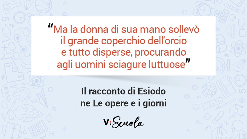 «Così disse ed essi obbedirono a Zeus signore, figlio di Crono. E subito l’inclito Ambidestro, per volere di Zeus, plasmò dalla terra una figura simile a una vergine casta; Atena occhio di mare, le diede un cinto e l’adornò; e le Grazie divine e Persuasione veneranda intorno al suo corpo condussero aurei monili; le Ore dalla splendida chioma, l’incoronarono con fiori di primavera; e Pallade Atena adattò alle membra ornamenti di ogni genere. Infine il messaggero Argifonte le pose nel cuore menzogne, scaltre lusinghe e indole astuta, per volere di Zeus cupitonante; e voce le infuse l’araldo divino, e chiamò questa donna Pandora, perché tutti gli abitanti dell’Olimpo l’avevano portata in dono, sciagura agli uomini laboriosi. Poi, quando compì l’arduo inganno, senza rimedio, il Padre mandò a Epimeteo l’inclito Argifonte portatore del dono, veloce araldo degli dèi; né Epimeteo pensò alle parole che Prometeo gli aveva rivolto: mai accettare un dono da Zeus Olimpio, ma rimandarlo indietro, perché non divenga un male per i mortali. Lo accolse e possedeva il male, prima di riconoscerlo. Prima infatti le stirpi degli uomini abitavano la terra del tutto al riparo dal dolore, lontano dalla dura fatica, lontano dalle crudeli malattie che recano all’uomo la morte (rapidamente nel dolore gli uomini avvizziscono). Ma la donna di sua mano sollevò il grande coperchio dell’orcio e tutto disperse, procurando agli uomini sciagure luttuose. Sola lì rimase Speranza nella casa infrangibile, dentro, al di sotto del bordo dell’orcio, né se ne volò fuori; ché Pandora prima ricoprì la giara, per volere dell’egioco Zeus, adunatore dei nembi. E altri mali, infiniti, vanno errando fra gli uomini».