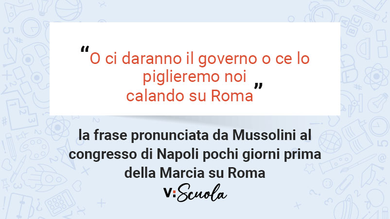 Il 24 ottobre si tenne a Napoli il Congresso fascista, al quale parteciparono circa 15mila persone e Mussolini ‘lodò’ la calda accoglienza riservatagli dalla popolazione partenopea. Nel pomeriggio, poi, la minaccia: “O ci daranno il Governo o ce lo piglieremo noi calando su Roma”, mentre Facta scriveva al re che il progetto della marcia sulla Capitale fosse da considerare ormai tramontato, lamentando poi il giorno seguente attività insurrezionali un po’ in tutta Italia.