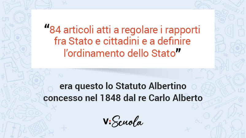Lo Statuto Albertino è una Costituzione scritta, concessa dal re senza nessuna consultazione democratica. Modificabile con una legge ordinaria, è composto da soli 84 articoli, che si limitano a regolare i rapporti fra Stato e cittadini e a definire l’ordinamento dello Stato. Vengono riconosciute le libertà fondamentali del cittadino, ossia la libertà di stampa e di opinione, la proprietà privata e il diritto di uguaglianza, che però resta sulla carta perché, ad esempio, il suffragio è ristretto riconoscendo il diritto di voto al 2% della popolazione. Per quanto riguarda la libertà religiosa, lo Statuto riconosce la religione cattolica come religione di Stato, dichiarando di “tollerare” le altre religioni.