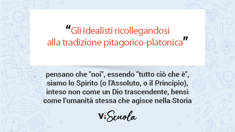 L’idealismo, una corrente filosofica sviluppatasi in Germania tra la fine del XVIII secolo e l’inizio del XIX, nasce proprio nel momento in cui la ‘cosa in sé’ viene abolita, mostrandone la duplice contraddittorietà. Gli idealisti, infatti, ricollegandosi alla tradizione pitagorico-platonica, pensano che ‘noi’, essendo ‘tutto ciò che è’, siamo lo Spirito (o l’Assoluto, o il Principio), inteso non come un Dio trascendente, bensì come l’umanità stessa che agisce nella Storia. La Natura, invece, è il ‘fenomeno’ che balena allo Spirito: in realtà, però, non è che un suo prodotto, dal momento che la ‘cosa in sé’ non esiste. Quindi, senza l’umanità non esiste l’universo, perché quest’ultimo, non essendo cosciente di sé, non potrebbe esistere. Un universo, che noi immaginiamo disabitato, è soltanto il frutto della nostra immaginazione. L’idealismo tedesco è una dottrina il cui capostipite è Johann Gottlieb Fichte, che si considera il vero erede di Kant. Egli, infatti, considera sostanzialmente valido l’intero pensiero del filosofo natio di Königsberg, tanto per quanto riguarda la scienza dei fenomeni, quanto per la teoria morale, ma con una sostanziale differenza: la ‘cosa in sé’ non esiste. I ‘fenomeni’, al contrario, vengono spiegati come una sorta di sogno dell’Io, chiamato ‘Non-Io’. Questo rappresenta tutto ciò che l’Io infinito e universale pone fuori di sé per individualizzarsi, per “rinascere” come ciascuno di noi, circondato, in uno “spazio-tempo” illusorio, dagli altri e dalla natura: una posizione originaria che avviene inconsciamente e che spiega perché i ‘fenomeni’ ci sembrano esterni e non come mero frutto della nostra immaginazione (né possiamo cambiarli per nostra volontà). Del resto, anche quando sogniamo non ci accorgiamo di sognare. Si tratta di un’immaginazione produttiva, da cui scaturisce, appunto, il mondo dei ‘fenomeni’, che agisce inconsciamente, e che corrisponde all’attività generatrice dell’Uno dei neoplatonici.