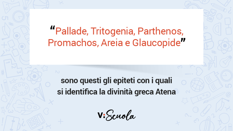 Per i romani è Minerva, ma anche gli stessi greci hanno diversi modi di chiamarla. L’epiteto più diffuso è Pallade, ma la sua origine resta misteriosa. Un mito fa risalire il nome a una compagna di giochi di Atena, che la dea uccide per errore e della quale prende il nome per il rimorso, mentre un altro racconto fa riferimento al gigante Pallade, trafitto dalla lancia di Atena quando combatte al fianco del padre Zeus nella Gigantomachia.