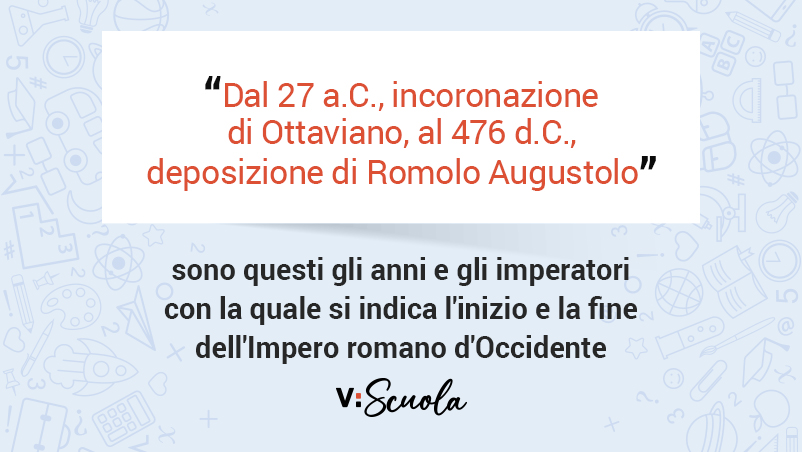L’Impero romano viene racchiuso nel periodo storico che va dal 27 a.C. con l’incoronazione di Ottaviano al 476 d.C. con la deposizione di Romolo Augustolo, ultimo imperatore romano d’Occidente. Il termine “Imperatore” proviene dal latino imperator, che viene conferito al condottiero che si distingue in ambito militare, religioso e civile. Per secoli però il “praenomen” attribuito al nome personale degli imperatori romani sarà caesar, in onore di Giulio Cesare, il dictator perpetuus.