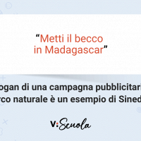In questo esempio l’espressione “mettere il becco” è una sineddoche laddove per becco si intende chiaramente l’animale (la parte per il tutto), suggerendo anche una identificazione tra visitatore e pellicano attraverso la prosopopea. Chiaramente la pubblicità non invita in Madagascar, ma all’interno del parco tematico, e l’utilizzo della sineddoche generalizzante suggerisce di rimando anche questo.
