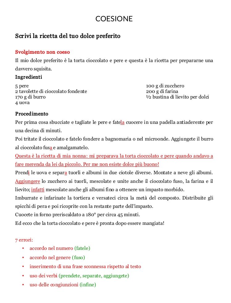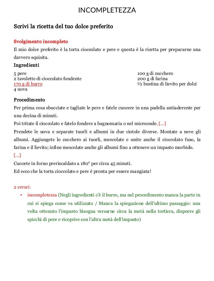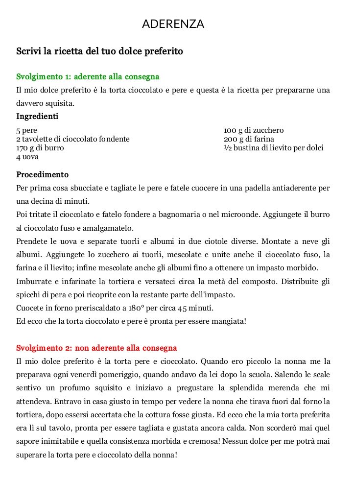 Nella scheda a lato trovi due esempi di svolgimento di una traccia che chiede di scrivere la ricetta del proprio dolce preferito. Il primo rispetta la consegna perché indica gli ingredienti e il procedimento da seguire per preparare la torta. Il secondo, invece, va fuori tema, perché racconta un aneddoto legato al dolce preferito da chi scrive, ma non spiega come cucinarlo. Se vuoi stampare la scheda, scarica il pdf qui: