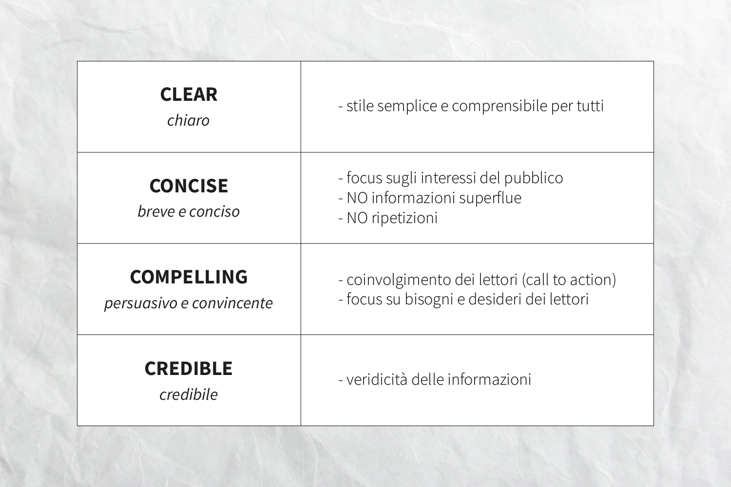 - Concise, cioè “breve e conciso”, perché devi concentrarti sugli interessi del pubblico a cui ti rivolgi senza aggiungere informazioni superflue e senza ripetizioni;