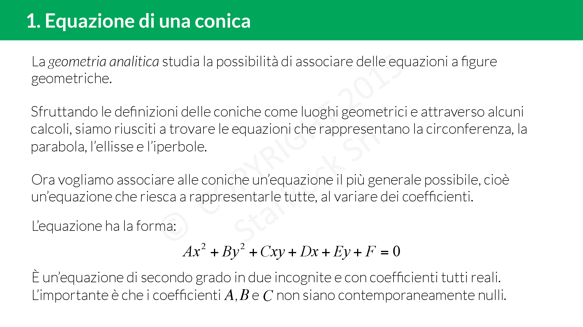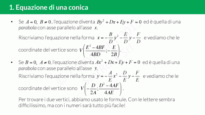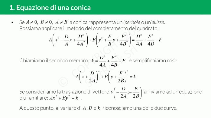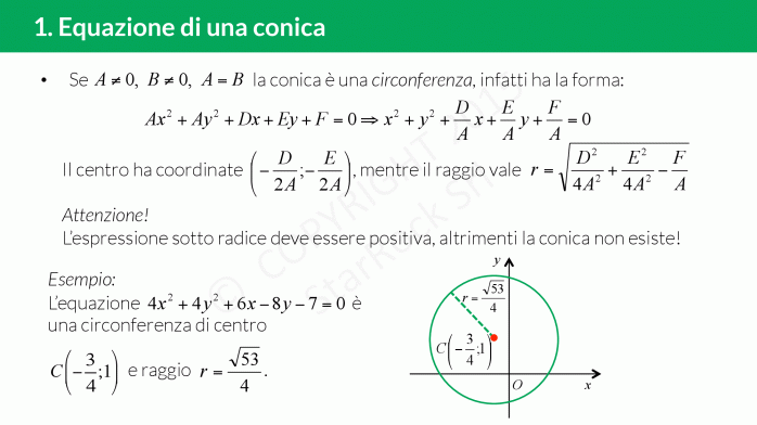 L’equazione ha la forma £$Ax^2+By^2+Cxy+Dx+Ey+F=0$£, cioè un’equazione di secondo grado in due incognite e con coefficienti reali: l’importante è che i coefficienti £$A$£, £$B$£ e £$C$£ non siano contemporaneamente nulli!