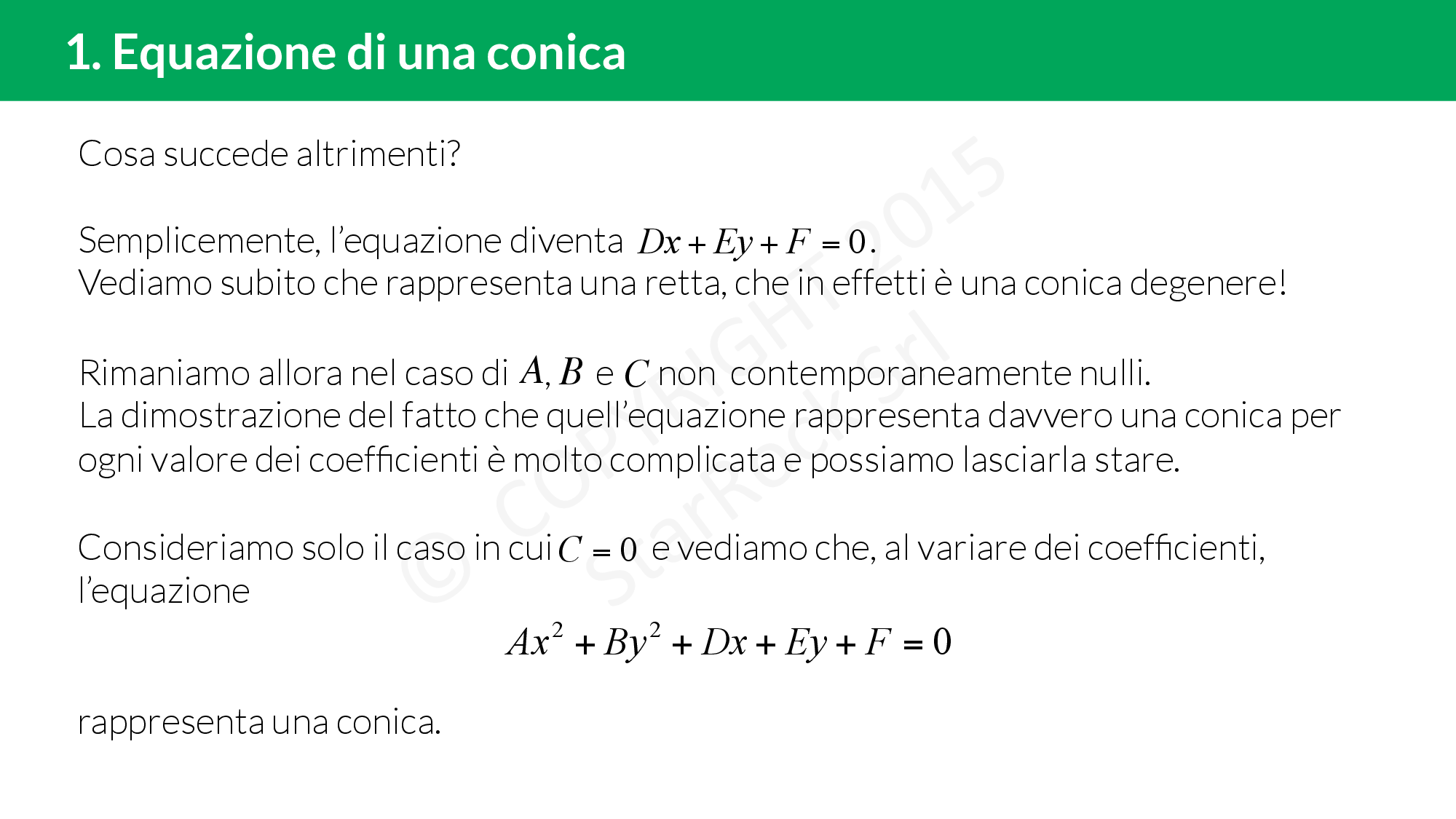 Vogliamo associare alle coniche un’equazione il più generale possibile, cioè un’equazione che riesca a rappresentarle tutte, al variare di alcuni coefficienti.