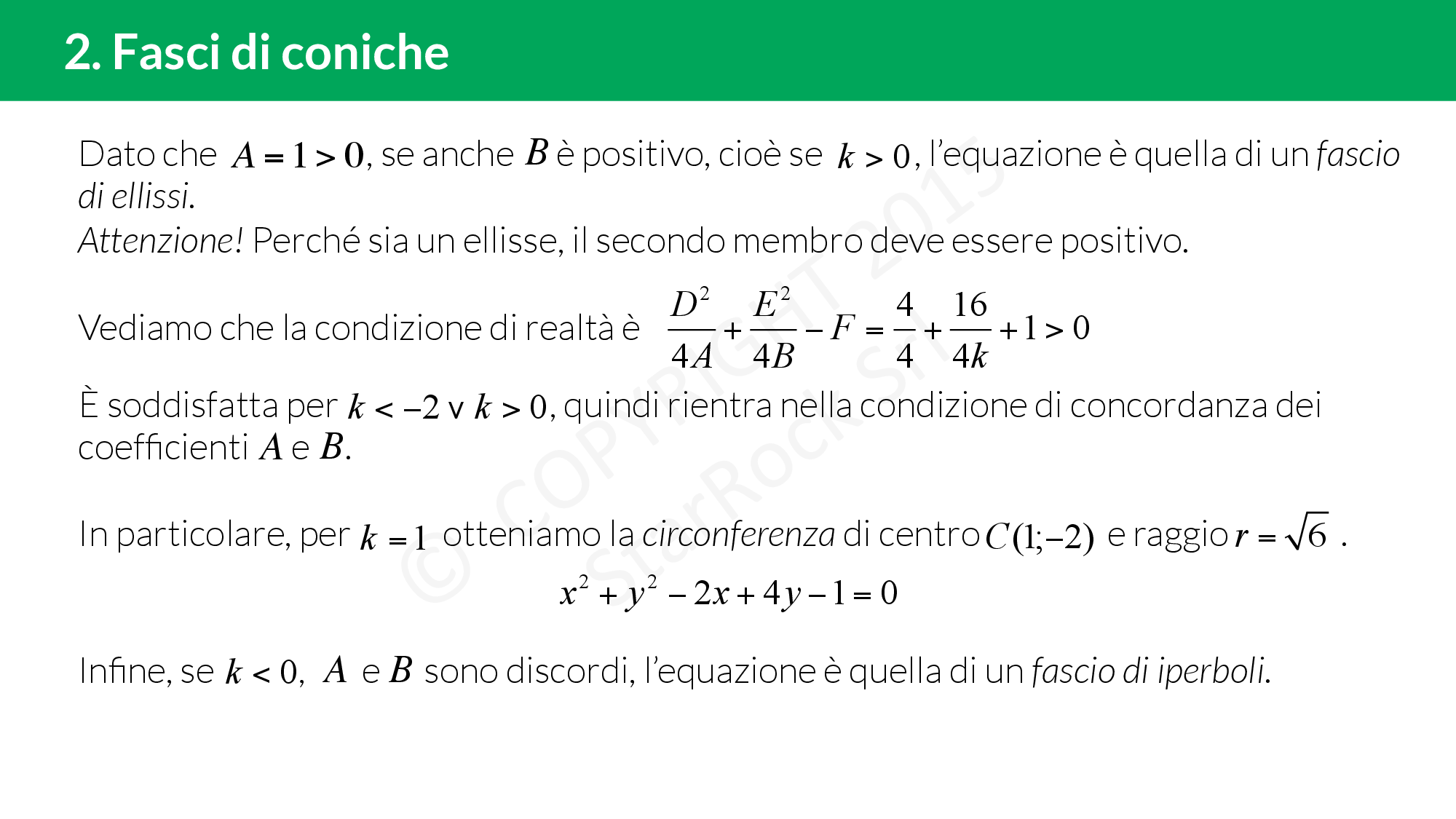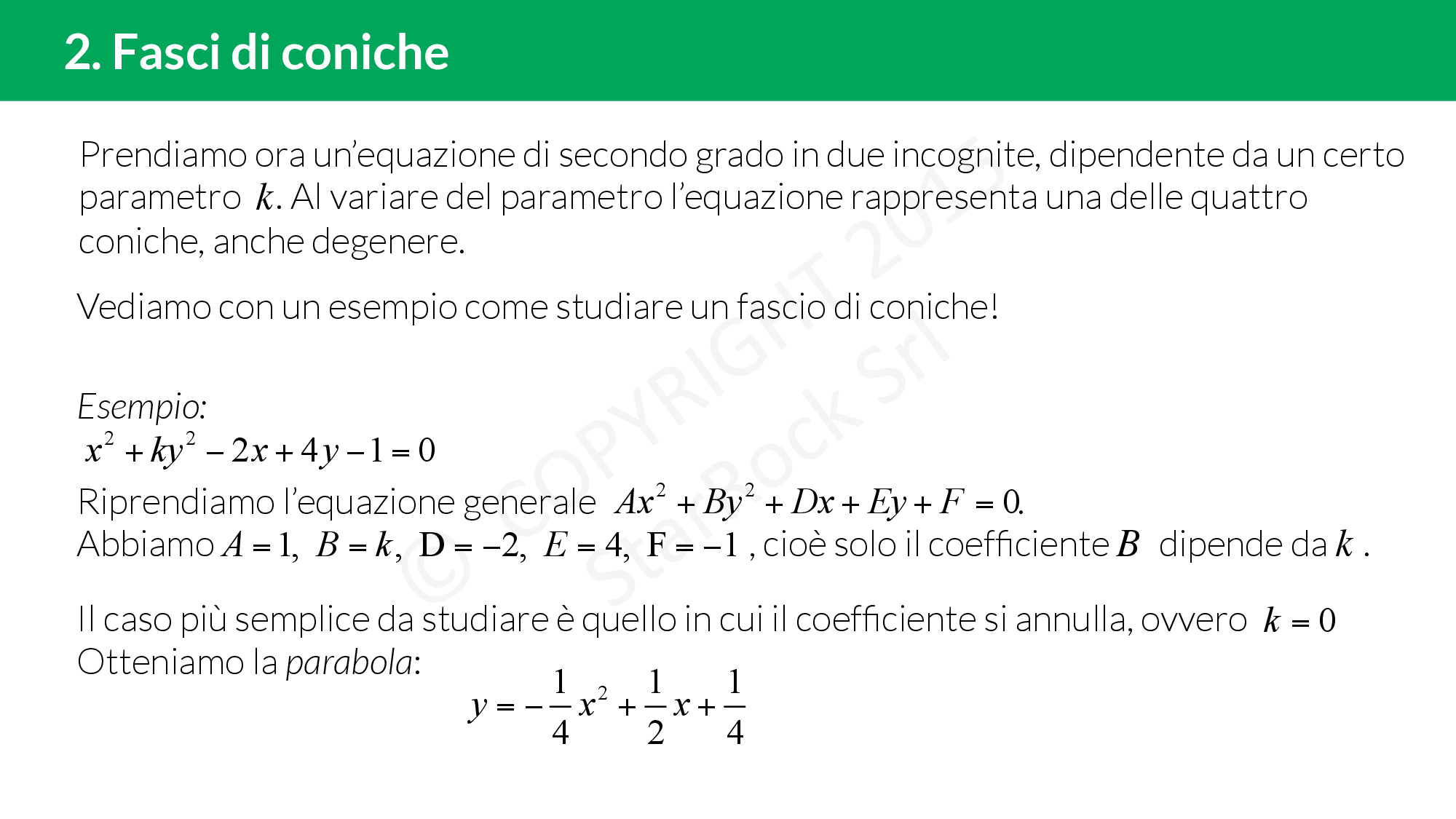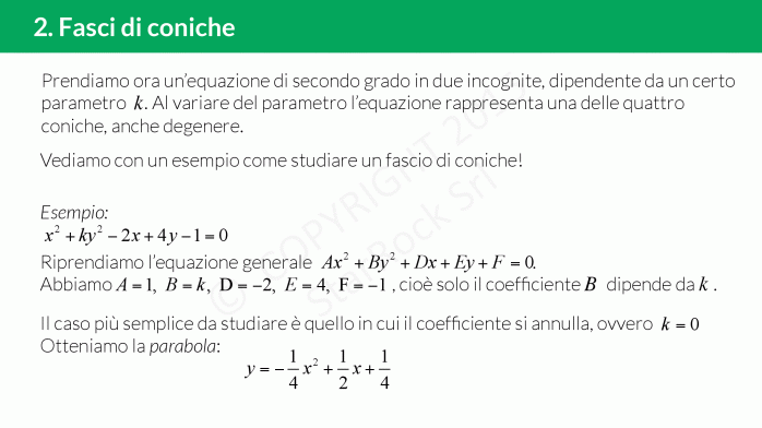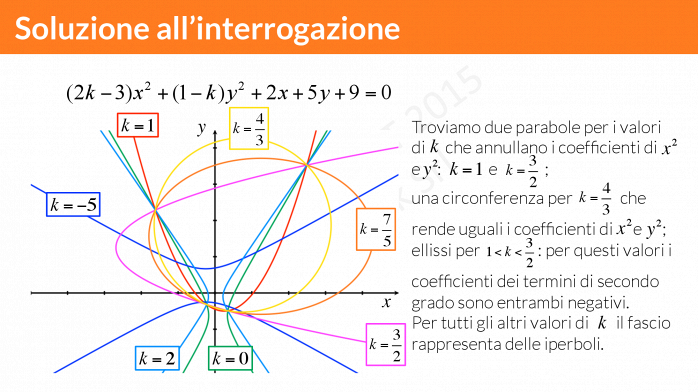 Quando abbiamo un’equazione di secondo grado in due incognite dipendente da un certo parametro £$k$£ siamo davanti ad un fascio di coniche: al variare del parametro l’equazione rappresenta una delle quattro coniche!
