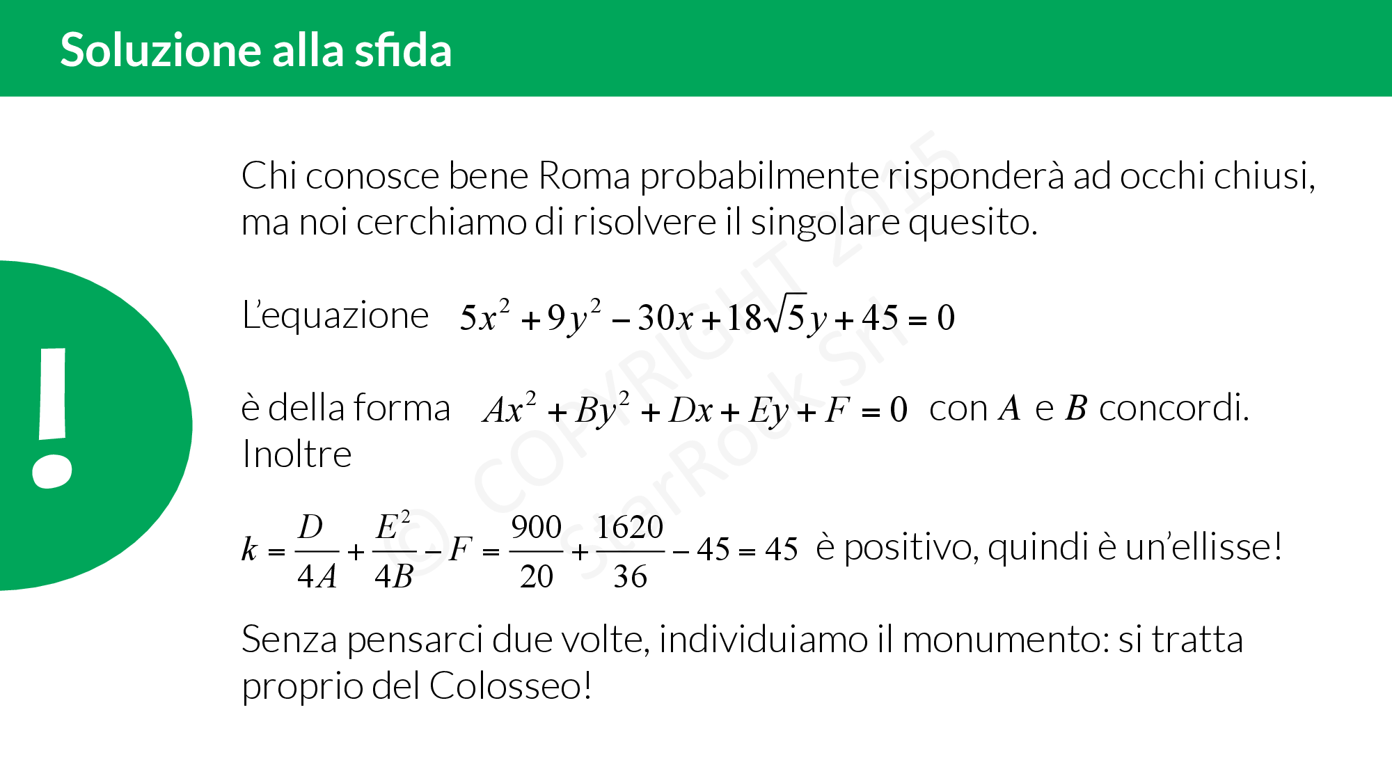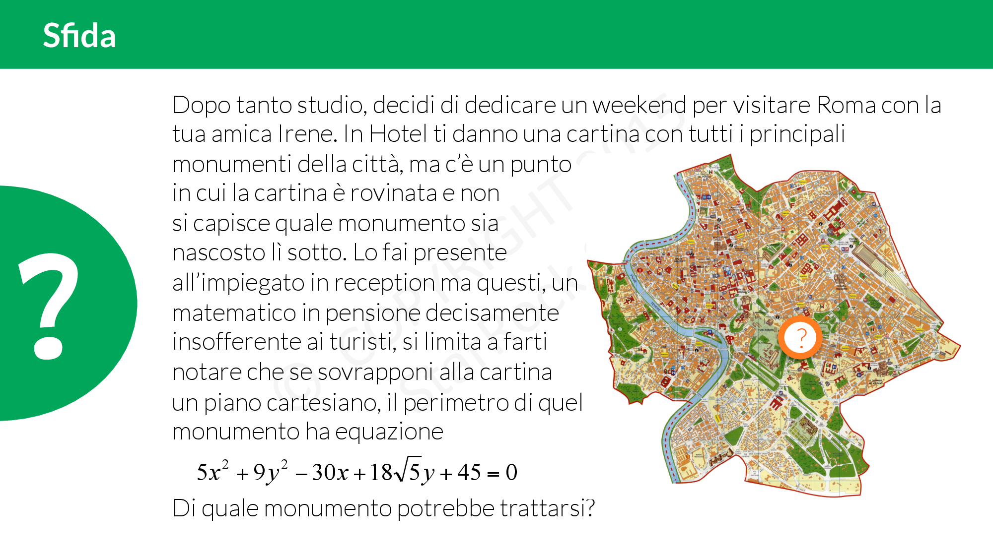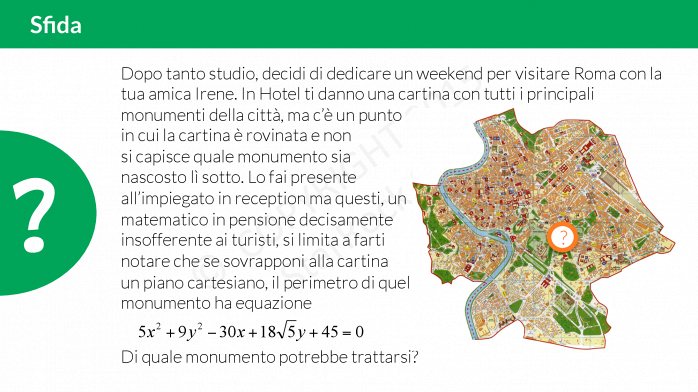 Decidi di visitare Roma con la tua amica: avete una cartina ma è rovinata! Cosa c’entra tutto questo con l’equazione di una conica? Scoprilo leggendo la sfida e provando a risolverla! Poi corri a fare gli esercizi!