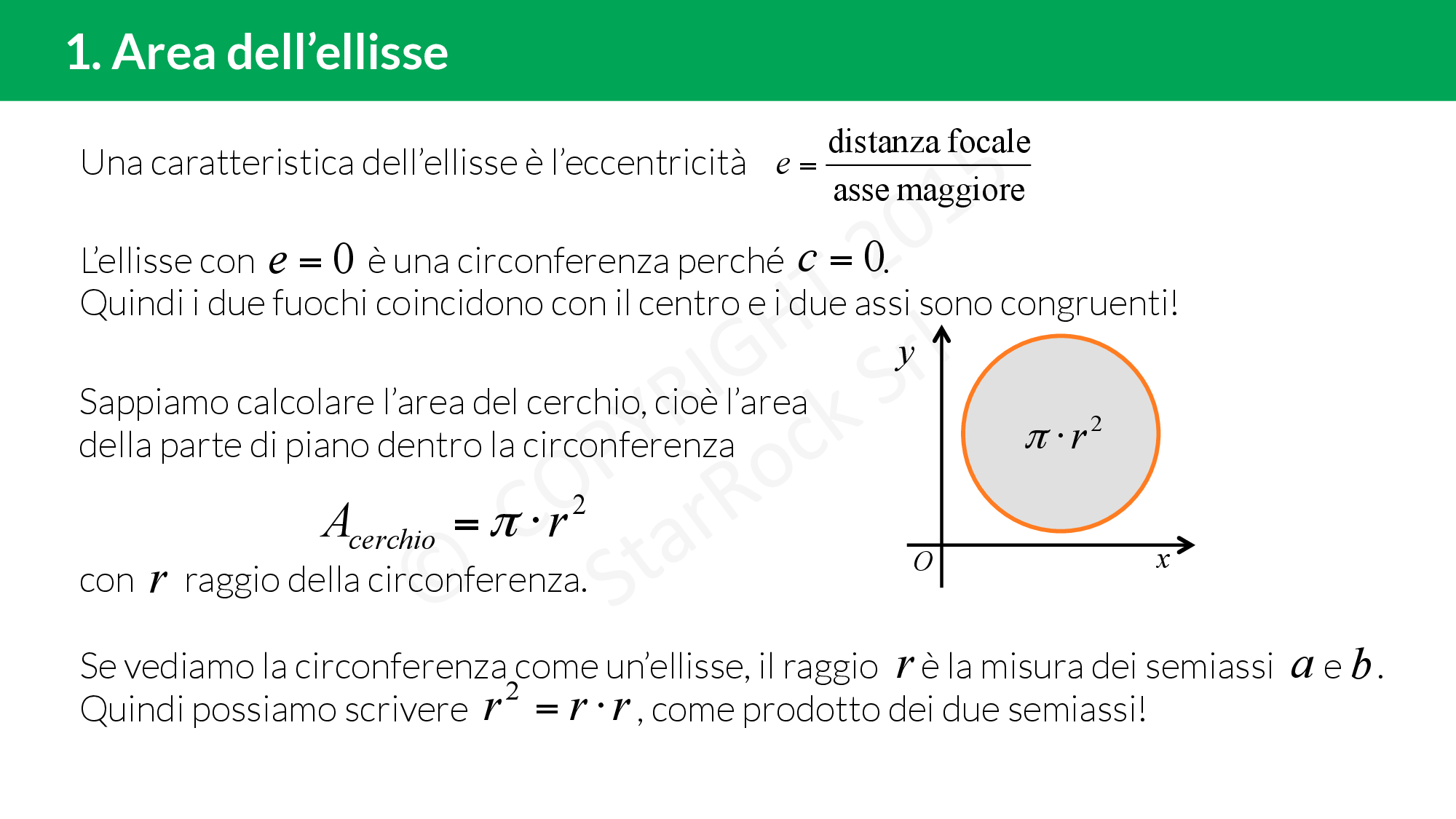 Finalmente lo studio dell’ellisse è quasi finito. Cosa manca? Beh sicuramente ti starai chiedendo: ma è possibile calcolare la misura della superficie racchiusa nell’ellisse? Certo che si può. Infatti sappiamo calcolare l’area del cerchio che è un’ellisse.